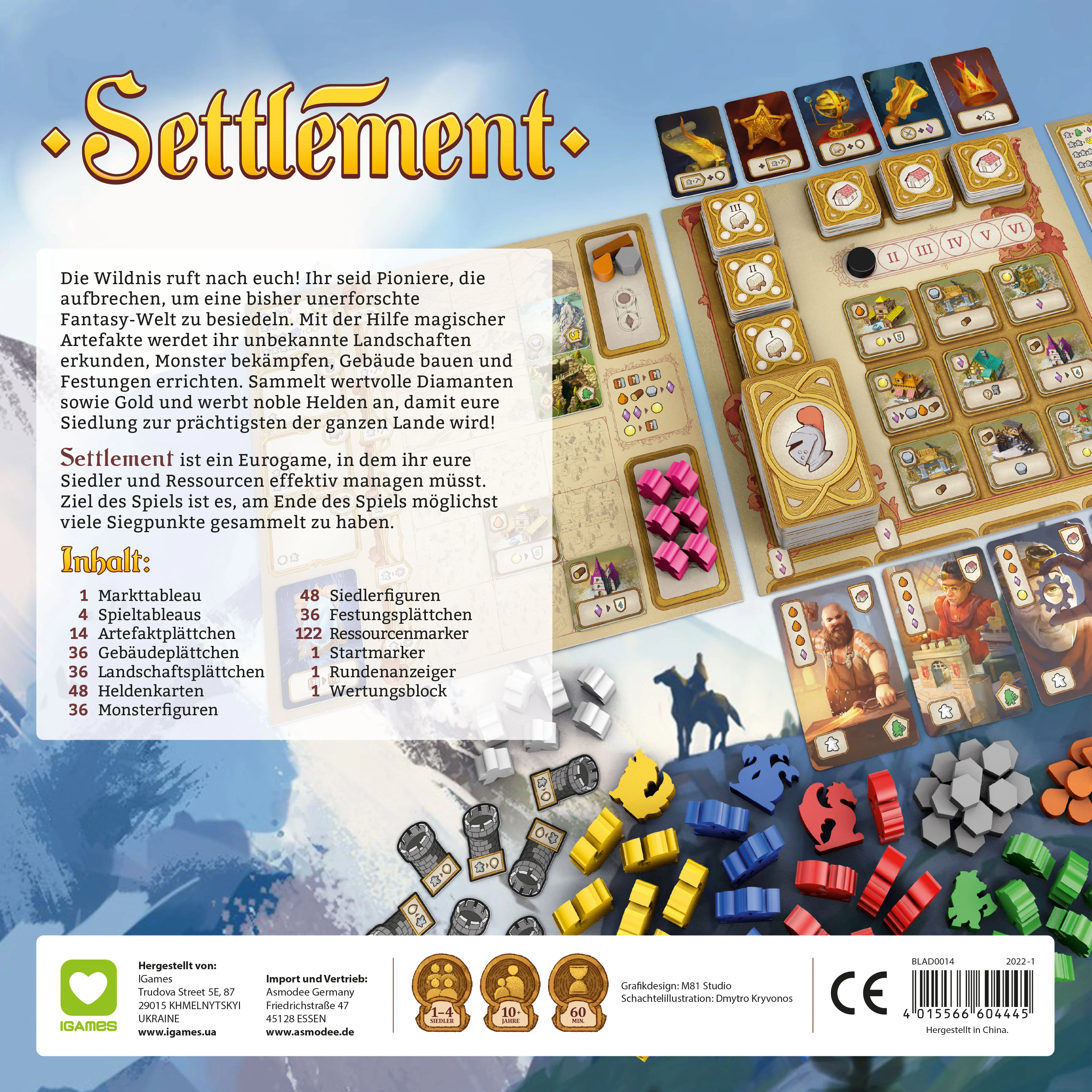 Settlement ist Kennerspiel und eine clevere Kombination aus Worker-Placement- und Engine-Building-Spiel mit intuitiven Regeln für einen leichten Spieleinstieg. Durch den flexiblen Spielaufbau hat das Spiel einen hohen Wiederspielwert und ist mit über 100 Holzteile, darunter Siedler- und Monsterfiguren, sehr schön ausgestattet.