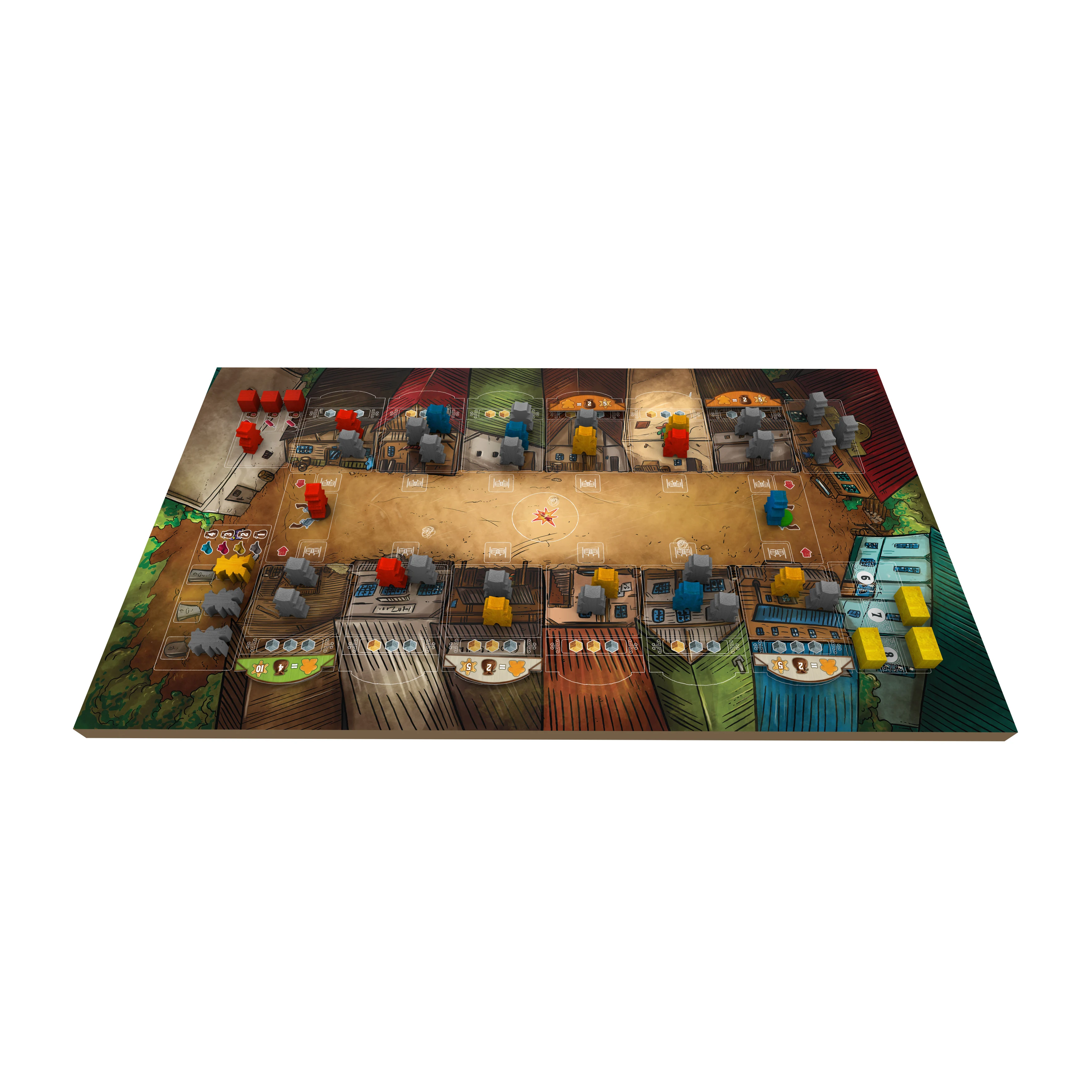 Inhalt: 1 Spielplan, 37 Meeple-Figuren, 32 Schildplättchen, 4 Showdown-Marker, 2 Showdown-Würfel, 57 Gold-, Stein- und Dynamitwürfel, 5 Goldbarren, 1 Beutel, 1 Spielanleitung