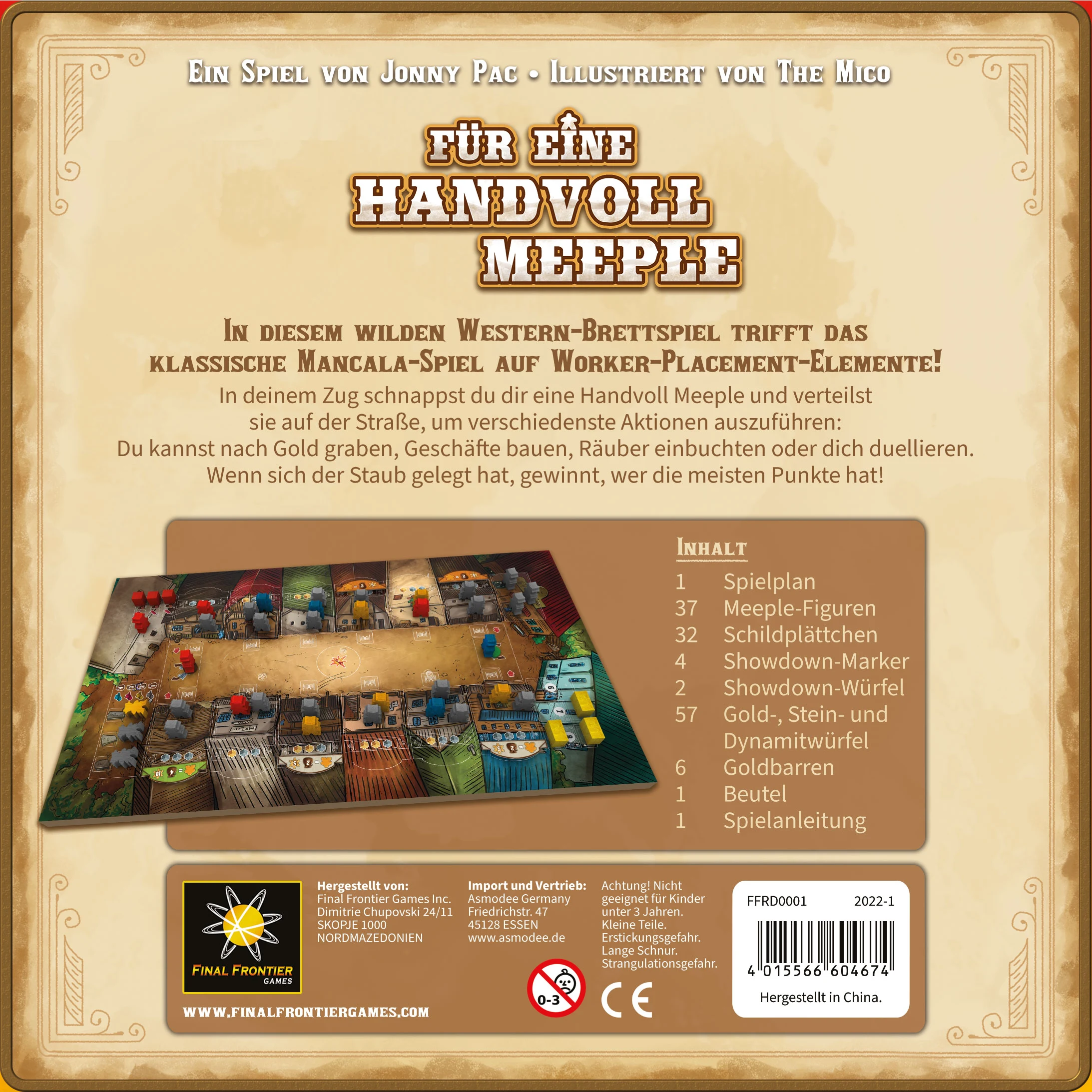 Im Spiel Für eine Handvoll Meeple trifft im "Wilden Westen" das klassische Mancala auf Worker-Placement-Elemente. In jede Runde schnappen sich die Spielenden eine Handvoll Meeple und verteilen sie auf dem Spielplan, um verschiedenste Aktionen auszuführen. So kann man nach Gold graben, Gebäude in Besitz nehmen, sich auf der Straße duellieren oder explosive Gefängnisausbrüche über die Bühne bringen.