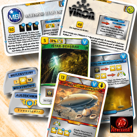 Das Spielbrett hat Fortschrittsleisten für die Temperatur, den Sauerstoffgehalt, den Terraformwert und die Generationen. Dort ist eine Karte der Marsoberfläche zu sehen, auf die während des Spiels Ozean-, Grünflächen- und Stadtplättchen platziert werden. Außerdem ist eine Auflistung aller verfügbaren Standardprojekte abgebildet sowie die Meilensteine und Auszeichnungen, um die alle Spieler wettstreiten.