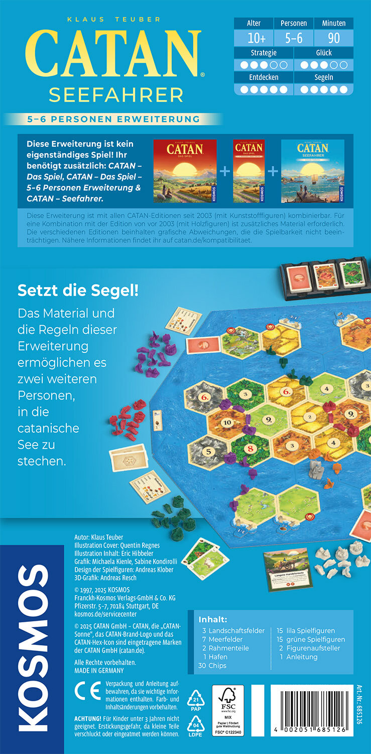 Mit der CATAN - Seefahrer Ergänzung 5 - 6 Spieler (Version 2025) können zwei weitere Spielende herausfinden welche Schätze rund um Catan zu finden sind. Die Bewohnerinnen und Bewohner Catans verlassen ihre Insel. Sie bauen Schiffe und begeben sich auf eine Reise ins Ungewisse. Hier warten viele Herausforderungen und Gefahren auf sie: Können sie die Piraten besiegen, genügend Stoffe tauschen und ihre „Catanischen Wunder“ vollenden? Ein größeres Spielfeld sorgt für abwechslungsreiche Abenteuer.