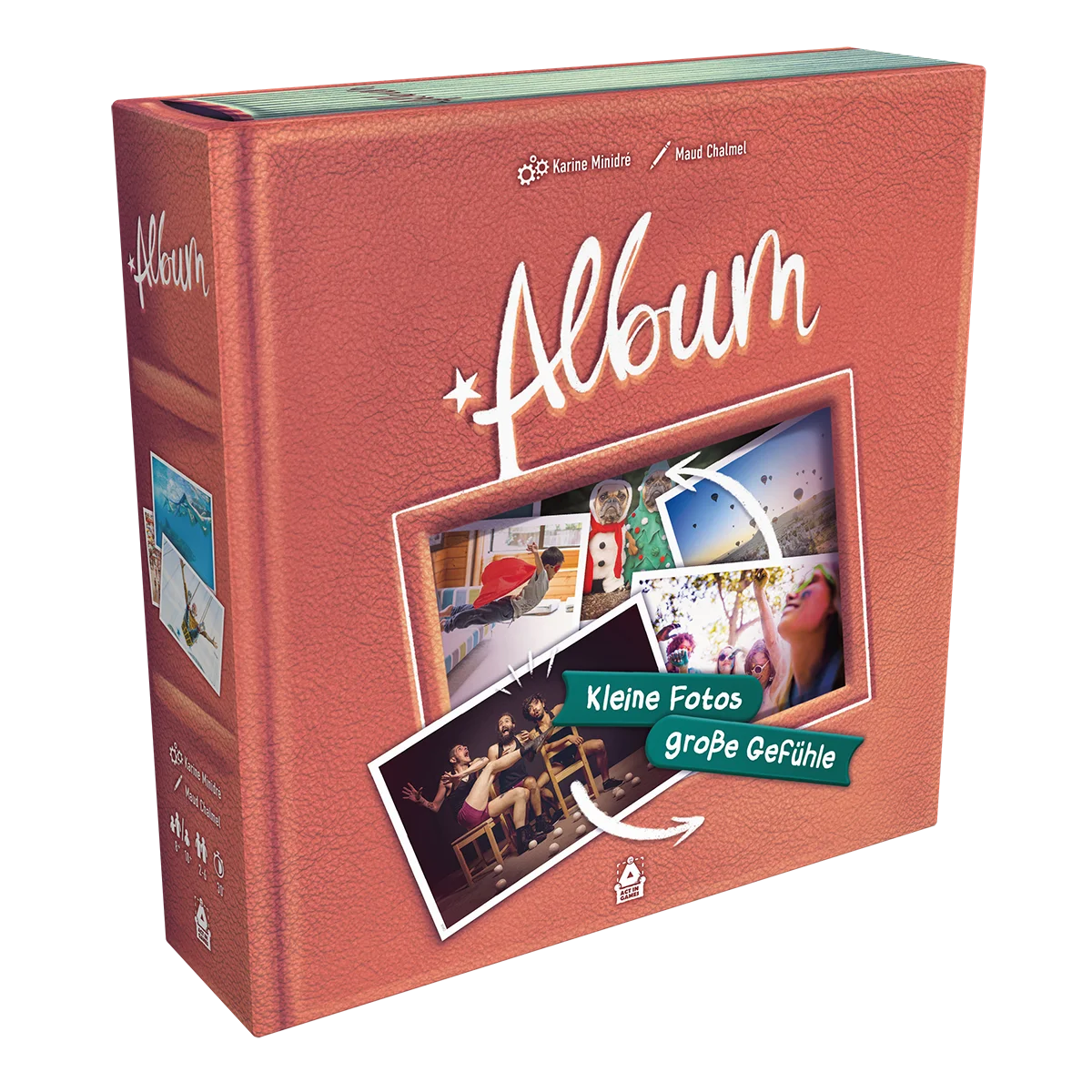 Im Spiel Album stellen alle gemeinsam ein Fotoalbum zusammen. Die Spielenden tauchen in die Welt der Fotos ein, erleben die Emotionen, die sie vermitteln und finden die schönsten Bilder für das Album. Jede Runde zieht eine Person ein Foto und sieht es sich an. Dazu muss dann ein Hinweis-Plättchen gelegt werden, um zu beschreiben, welche Gefühle das Foto in welcher Intensität auslöst. Das Foto wird dann mit 4 anderen vermischt. Die Mitspielenden müssen anhand der Hinweise erraten, welches das richtige Foto ist. Oft wurden große Gefühle auf Fotopapier gebannt. Nun muss mit wenigen Wörtern ausgedrückt werden, was man beim Betrachten des Fotos fühlt. Wird es gelingen, in 6 Runden das perfekte Album zusammenzustellen?