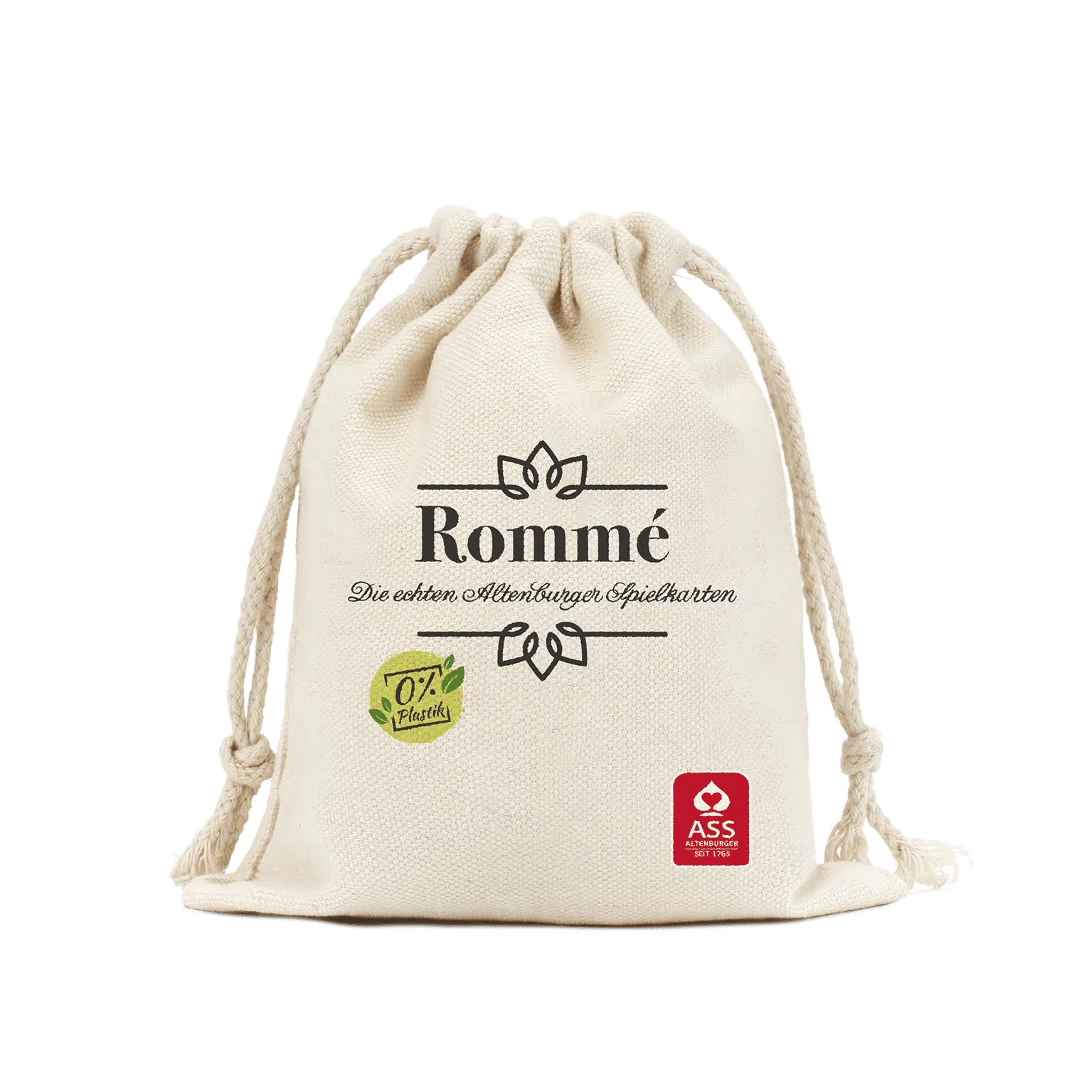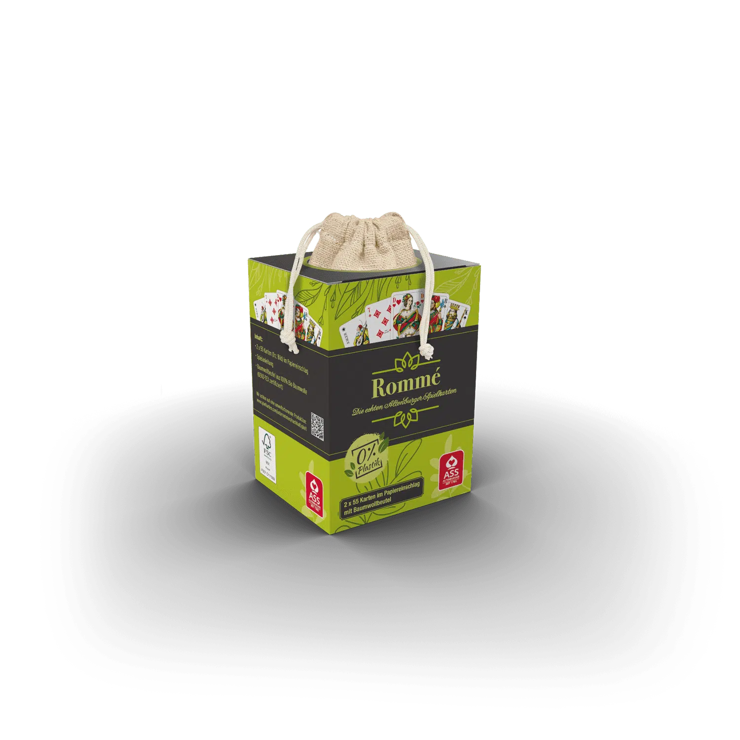 Rommé plastikfrei ist die umweltfreundlich Version und kommt komplett ohne Plastik aus. Die Karten, Spielanleitung, Verpackung bestehen aus FSC®-zertifiziertem Material sowie anderen kontrollierten Materialien. Die Rommé-Karten haben das echte ASS Altenburger Kartenbild und sind statt Plastik, mit Papier eingeschlagen. Verpackt ist alles in einem praktischen, langlebigen Bio-Baumwollbeutel.
