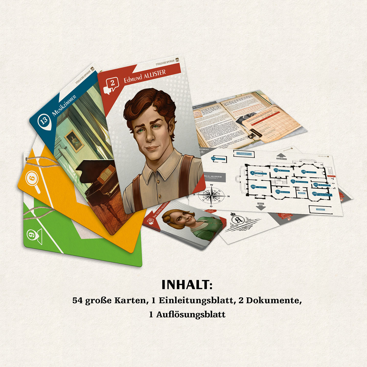 Inhalt: 54 große Karten, 1 Einleitungsblatt, 1 Auflösungsblatt, 2 Dokumente, 1 Spielanleitung
