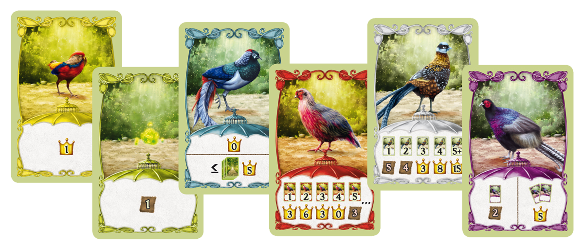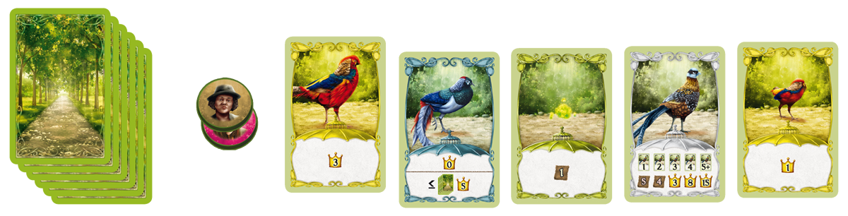Bei Fasanerie lauft ihr, mittels einfacher aber cleverer Spielregeln, entlang einer Allee, um wertvolle Karten einzusammeln und unliebsame liegen zu lassen. Leider sind noch andere Angestellte unterwegs und stören eure Pläne. Greift euch die schönsten Vögel, damit ihr am Ende die wertvollste Tiersammlung besitzt. Für jede Partie wählt ihr immer 6 der 12 verfügbaren Kartensorten. Somit könnt ihr bis zu 924 Kombinationen entdecken.