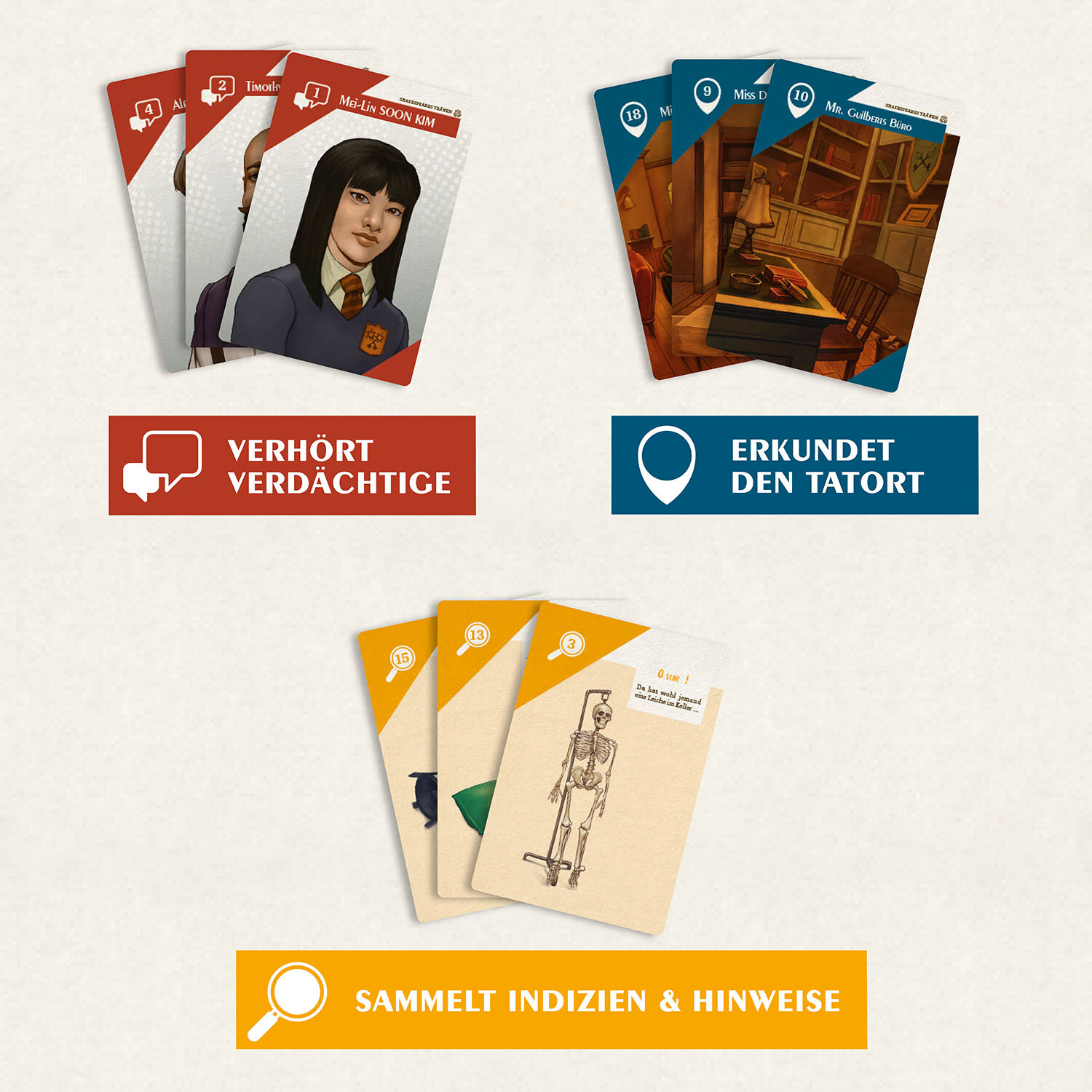 Inhalt: 55 große Karten, 1 Einleitungsblatt, 1 Auflösungsblatt, 3 Dokumente, 1 Spielanleitung