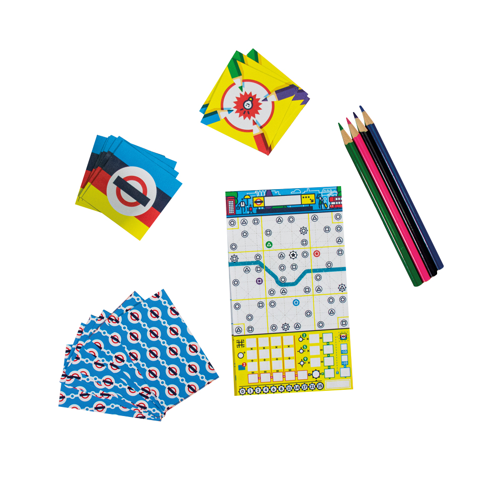 Inhalt: 1 London Underground Block (100 Seiten), 4 Buntstifte, 11 Stations-Karten, 5 Aufgaben-Karten, 4 Vorteils-Karten, Anleitung