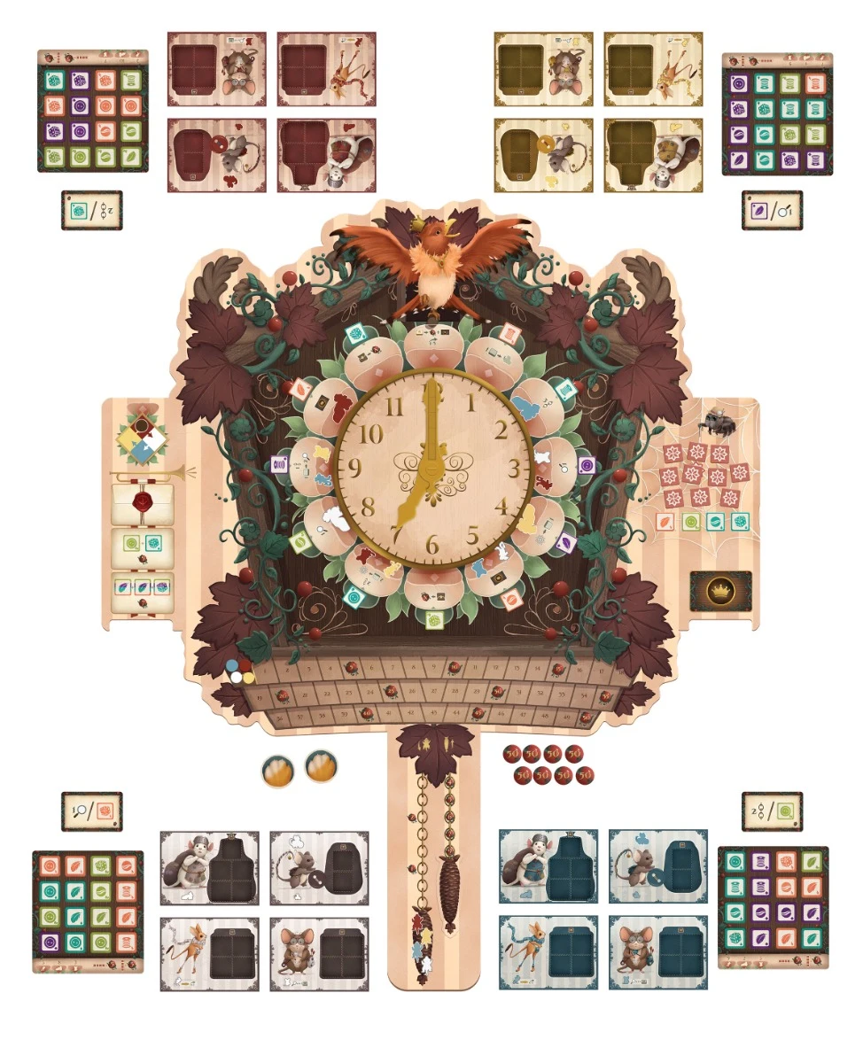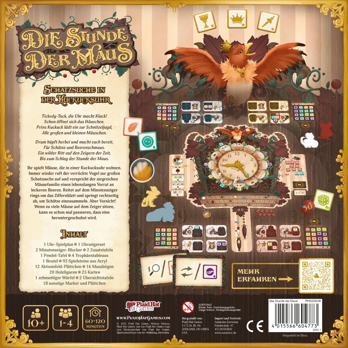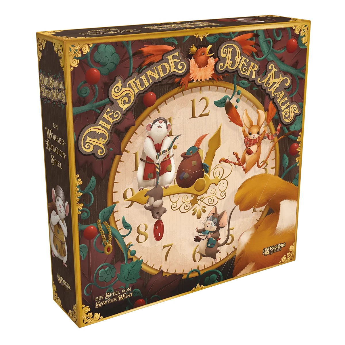 Die Stunde der Maus kombiniert Set-Collection mit ausgeklügelten Worker-Placement-Elementen und beinhaltet eine Solo-Variante. Das Spiel hat wunderschön illustriertes Spielmaterial inklusive Holzmausfiguren, Acryl-Trophäen und drehbaren Uhrzeigern. Dazu gibt es noch eine digitaler Hilfe zur Berechnung der Siegpunkte.