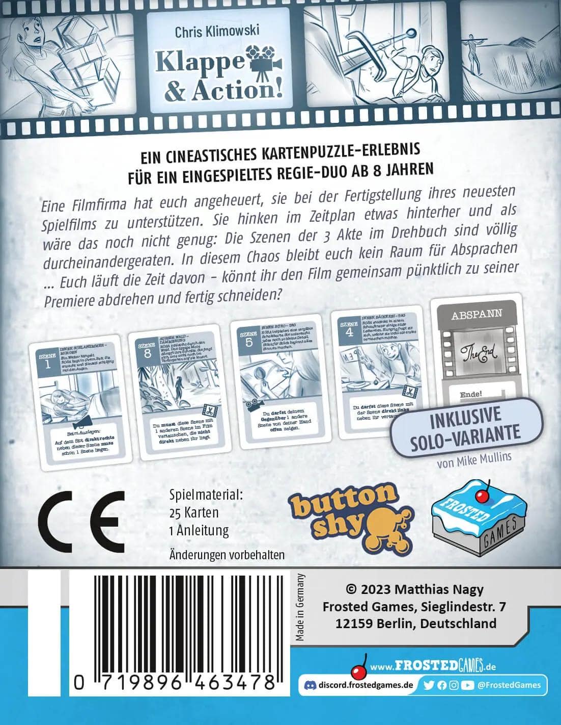 Bei Klappe & Action! müssen zwei Spielende gemeinsam den Dreh und den Schnitt eines Films beenden. Dabei wird über 3 Akte hinweg immer abwechselnd der Dreh und der Schnitt gespielt. Beim Dreh werden ohne zu kommunizieren abwechselnd Szenen auf freie Slots des Films gelegt. Beim Schnitt darf man kommunizieren und führt gemeinsam die Schnitt-Effekte der gelegten Karten aus. Das Ziel ist, die Karten dabei in der richtigen Reihenfolge anzuordnen.