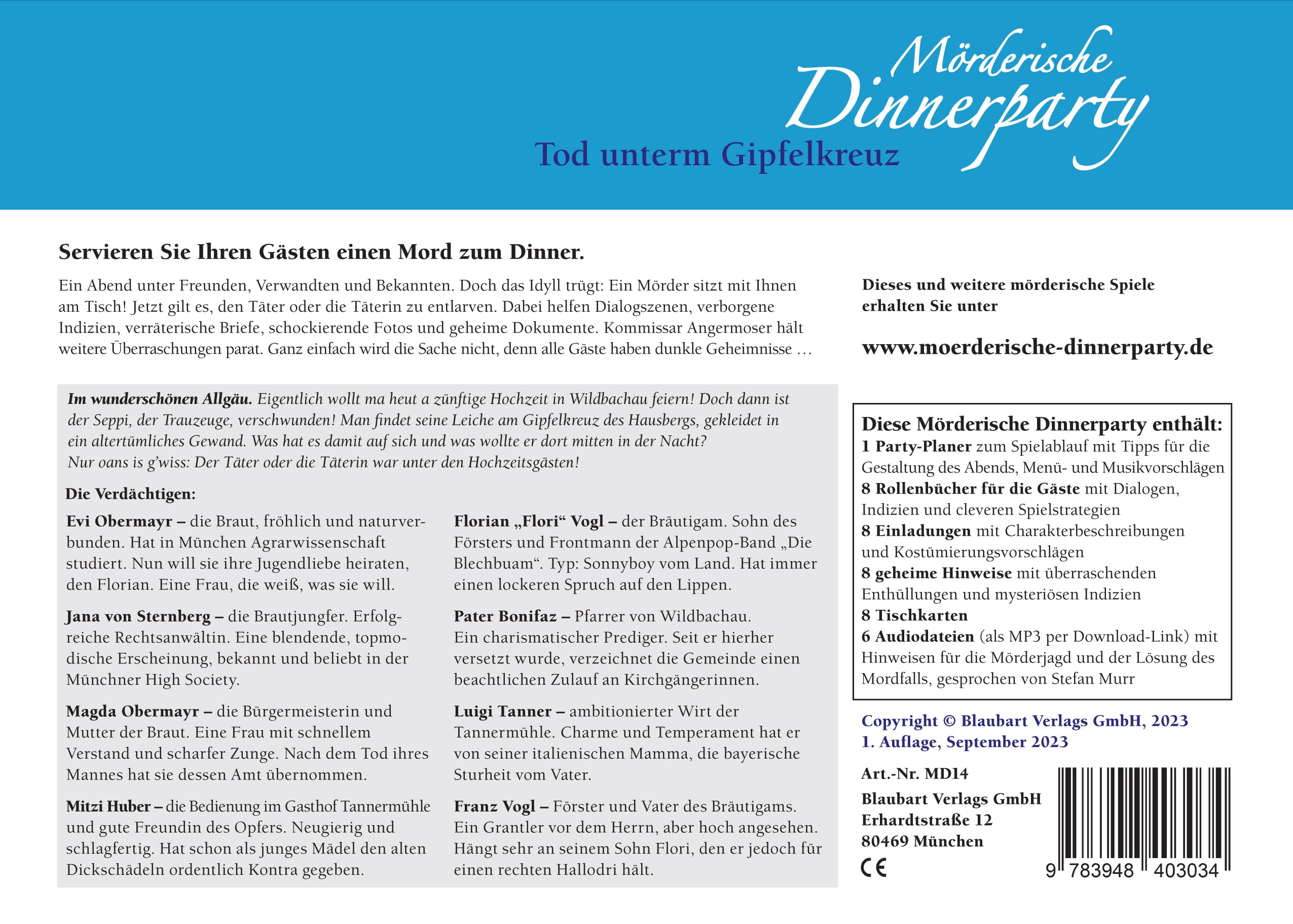 Mörderische Dinnerparty – Tod unterm Gipfelkreuz ist ein Krimidinner für Zuhause. Ein Abend unter Freunden, Verwandten und Bekannten. Doch das Idyll trügt: Ein Mörder sitzt mit amTisch! Jetzt gilt es, den Täter zu entlarven. Dabei helfen Dialogszenen, verborgene Indizien, verräterische Briefe, schockierende Fotos und geheime Dokumente. Und eine Stimme, die weitere Überraschungen parat hält. Ganz einfach wird die Sache nicht, denn jeder der Gäste hat ein dunkles Geheimnis...