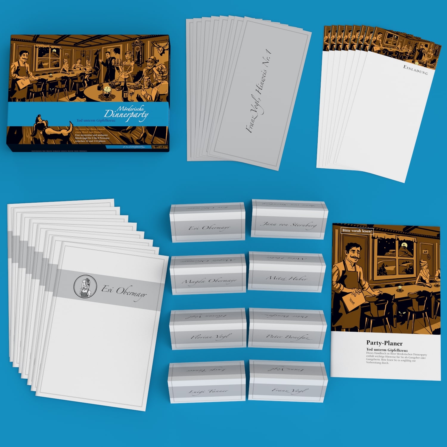 Inhalt: 1 Party-Planer zum Spielablauf mit Tipps für die Gestaltung des Abends, Menü- und Musikvorschlägen; 8 Rollenbücher für die Gäste mit Dialogen, Indizien und cleveren Spielstrategien; 8 Einladungen mit Charakterbeschreibungen und Kostümierungsvorschlägen; 8 geheime Hinweise mit überraschenden Enthüllungen und mysteriösen Indizien; 8 Tischkarten; 6 MP3-Audiodateien (per Download) mit Hinweisen für die Mörderjagd und der Lösung des Mordfalls.