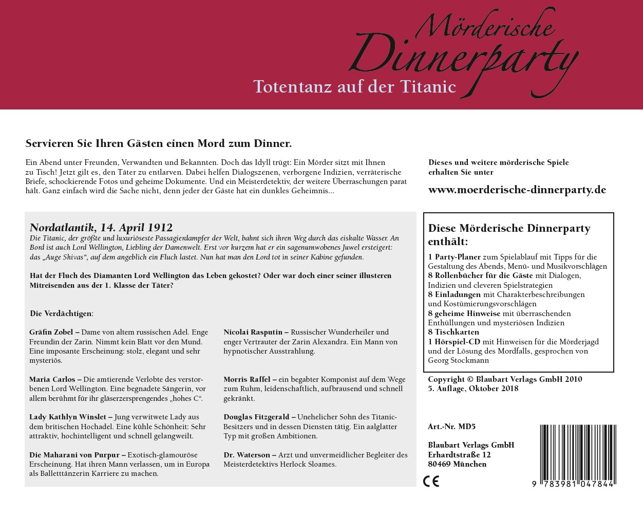 Mörderische Dinnerparty – Totentanz auf der Titanic ist ein Krimidinner für Zuhause. Ein Abend unter Freunden, Verwandten und Bekannten. Doch das Idyll trügt: Ein Mörder sitzt mit amTisch! Jetzt gilt es, den Täter zu entlarven. Dabei helfen Dialogszenen, verborgene Indizien, verräterische Briefe, schockierende Fotos und geheime Dokumente. Und eine Stimme, die weitere Überraschungen parat hält. Ganz einfach wird die Sache nicht, denn jeder der Gäste hat ein dunkles Geheimnis... Aber Sherlock Holmes ist an Bord und ermittelt.