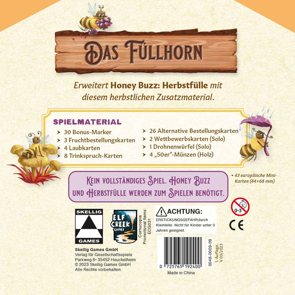 Die Honey Buzz – Herbstfülle: Füllhorn - Mini-Erweiterung enthält neue Komponenten, die in beliebiger Kombination in das Spiel Honey Buzz: Herbstfülle eingebaut werden kann. Einige führen neue Regeln ein, die den Spielablauf verändern, während andere die Vielfalt des Spiels erhöhen.