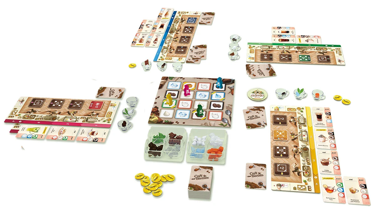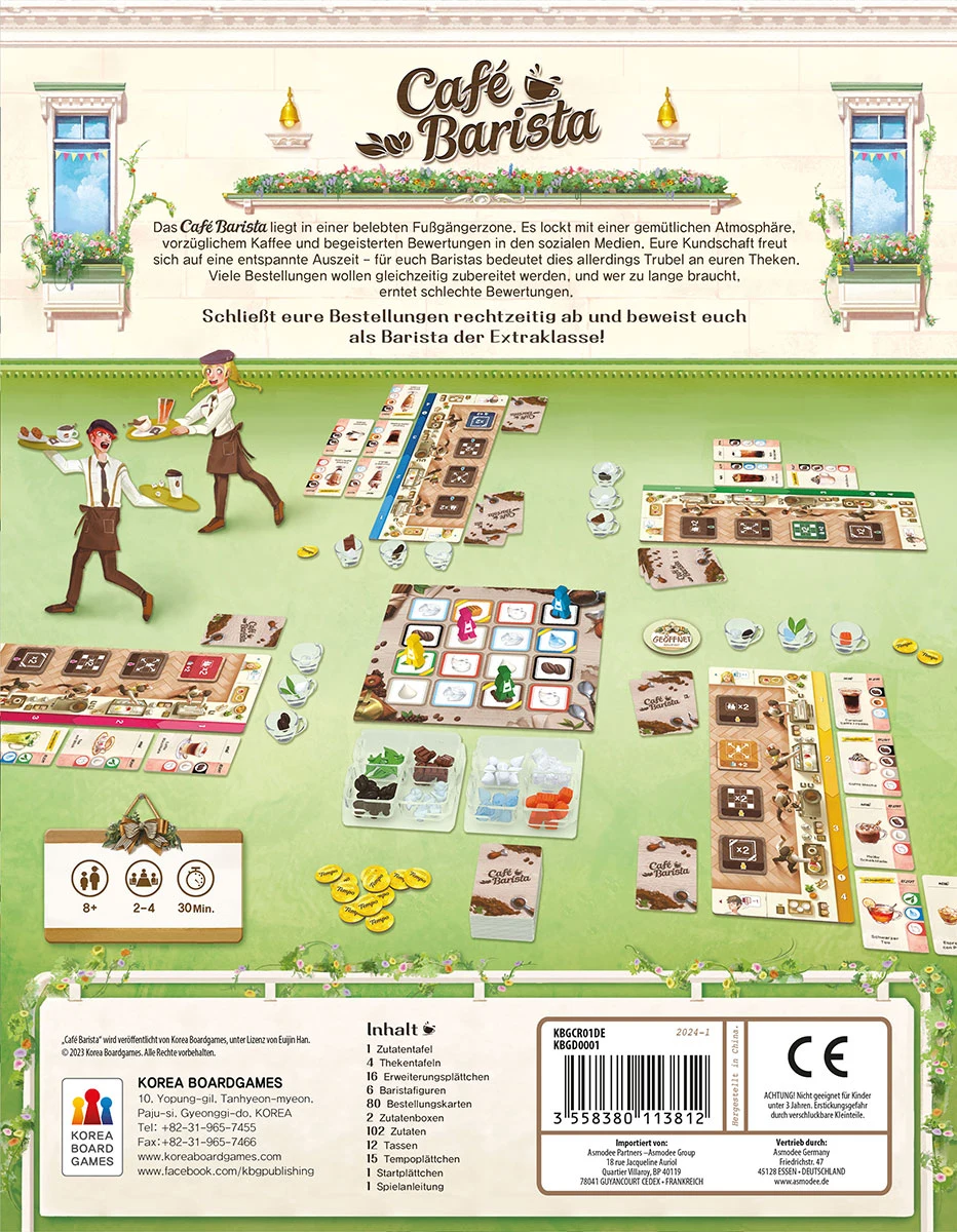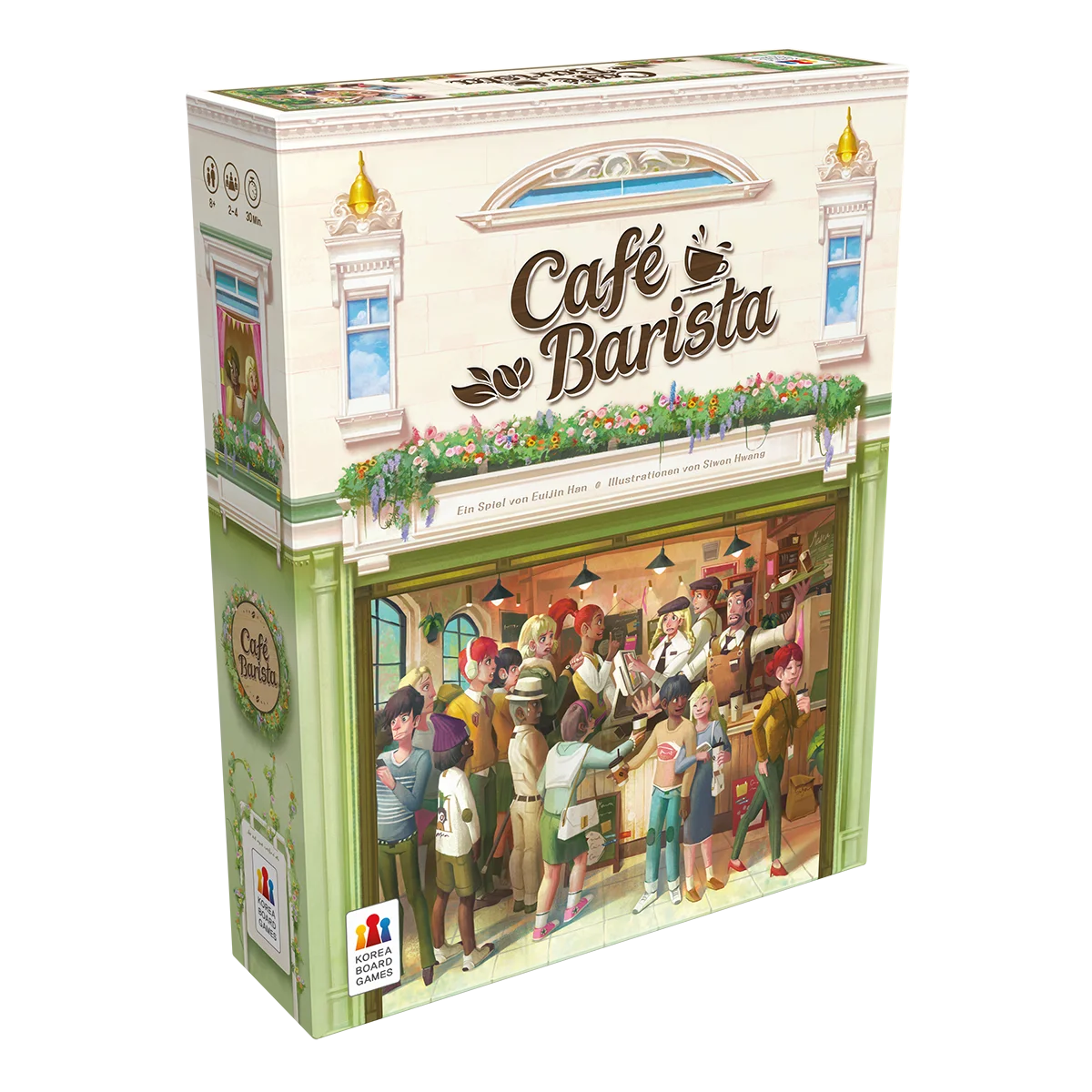 Bei Café Barista müssen die Mitspielenden ihren Gästen die gewünschten Kaffespezialitäten zubereiten und servieren. Und wie auch in einem echten Café werdem viele Bestellungen gleichzeitig zubereitet. Da müssen manche Gäste leider warten... Aber wer zu lange braucht, erntet Strafkarten und schlechte Bewertungen.