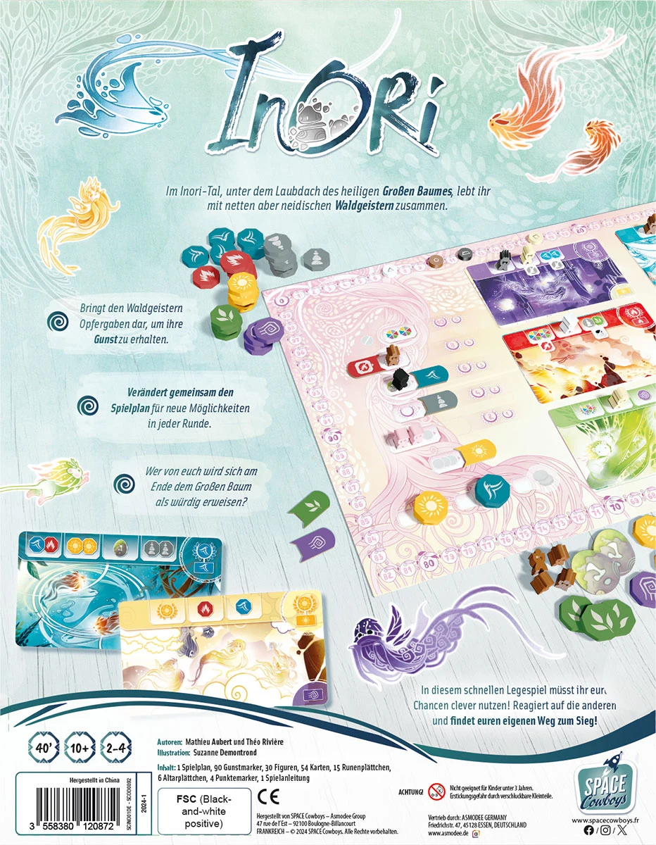 In dem Spiel Inori leben die Spielenden im Inori-Tal, unter dem Laubdach des heiligen Großen Baumes, mit netten aber neidischen Waldgeistern zusammen. Die Spielenden bringen den Waldgeistern jedes Jahr Opfergaben dar, um ihre Gunst zu erhalten und errichtet Altare zu Ehren des Großen Baumes. In jeder Runde verändern alle gemeinsam den Spielplan für neue Möglichkeiten. Wer am Ende die meisten Punkte hat, erweist sich dem Großen Baum als würdig und gewinnt!