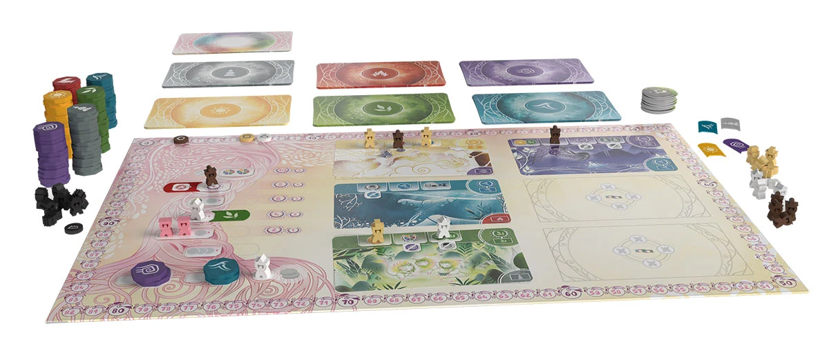 Inori ist ein Worker-Placement-Spiel mit einfachen Regeln aber taktischer Tiefe. Die Spielenden beeinflussen die Auslage und somit die Aktions-Möglichkeiten. Das Familienspiel hat außerdem wunderschöne Illustrationen und individuell geformte Figuren und Marker aus Holz.