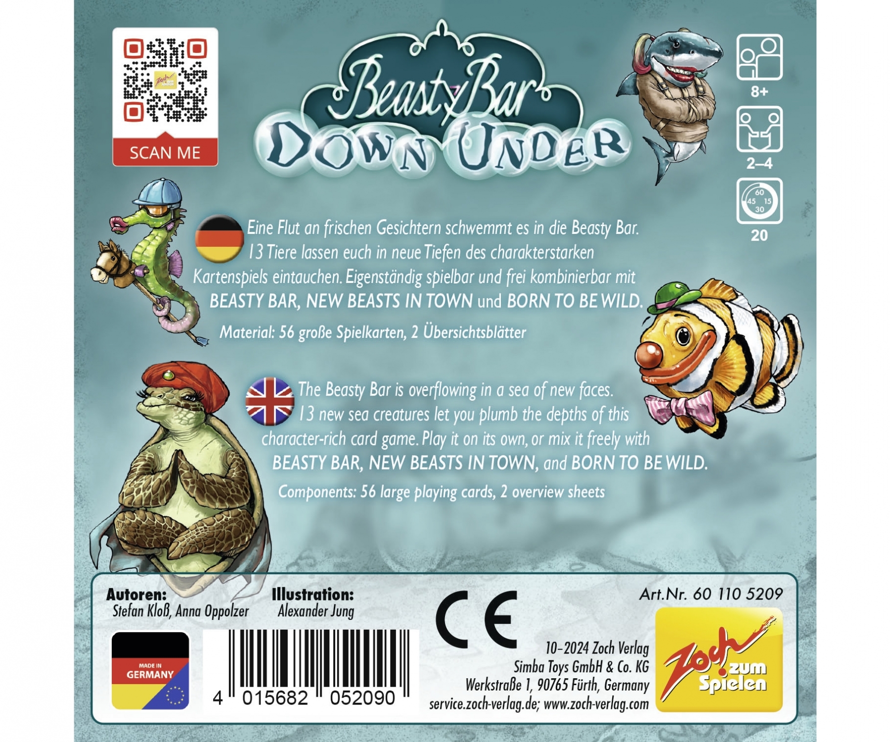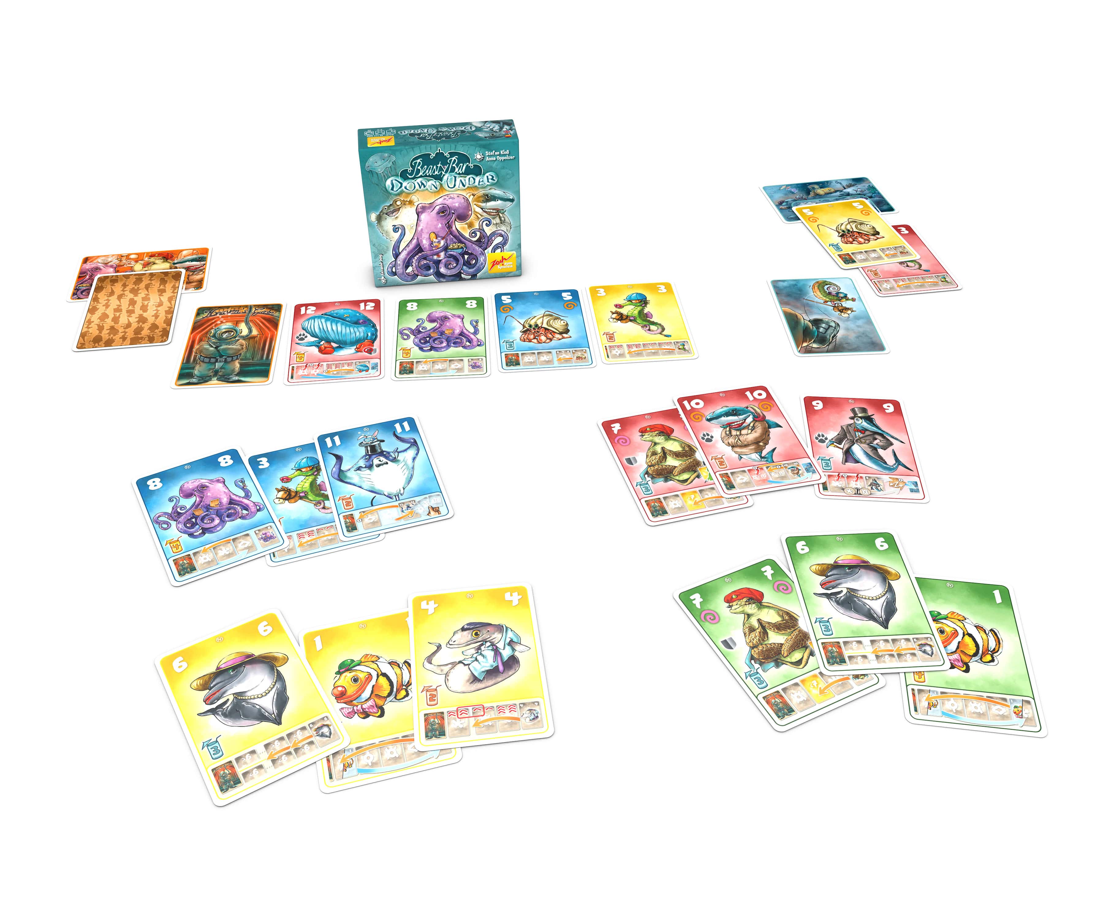 Bei Beasty Bar – Down Under nutzen die Spielenden die Tricks der Tiere um bis zum Eingang zu kommen: Der magische Manta nutzt ein Ablenkungsmanöver, der schmale Aal quetscht sich in jede noch so kleine Lücke und der noble Schwertfisch duelliert sich um einen Platz. Wer die meisten seiner Tiere in die Bar bekommt, gewinnt!
