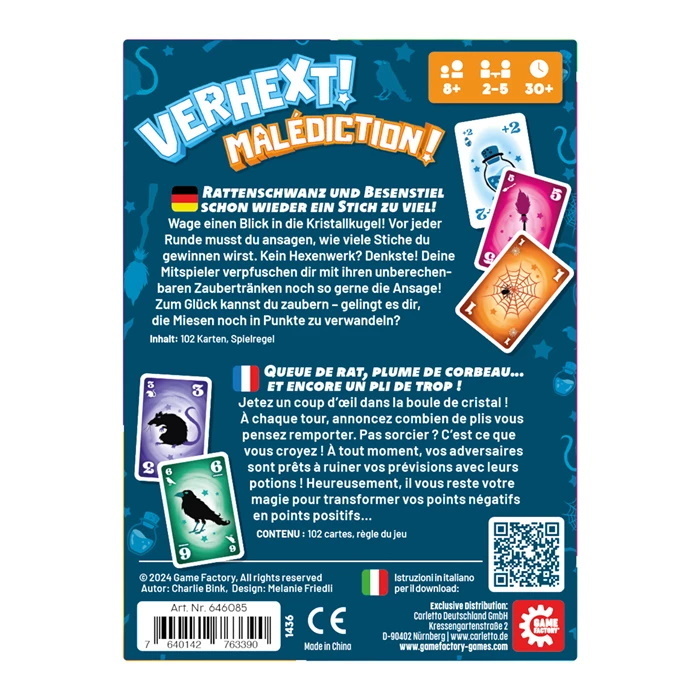 Verhext! ist ein unberechenbares Stich-Ansage-Spiel, denn die Zaubertränke sorgen für Überraschungen. Dank verhextem Wertungstwist bleibt die Spannung bis zum Schluss erhalten. Das Stichspiel hat eine geringe Einstiegshürde mit sprachneutralem Spielmaterial.