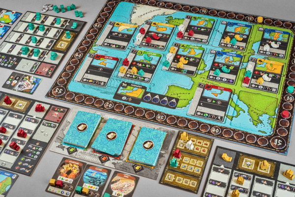 Inhalt: 1 Spielplan, 1 Jarl-Aktionstableau, 1 Tableau für Erkundungskarten, 4 Spielertableau, 4 Spielerhilfen, 1 Anleitung, 12 Territorien, 7 Wertungskarten, 9 HerrscherInnenkarten, 118 Erkundungskarten, 8 Jarl-Figuren, 24 Gesetzessprecher- Figuren, davon 4 legendär, 28 Langschiff-Figuren, davon 4 legendär, 20 Siedlungs-Figuren, davon 4 legendär, 16 Festungs-Figuren, davon 4 legendär, 12 Wertungs-Marker, 8 SP- und Spielreihenfolge Marker, 59 Silbermünzen im Wert von 1, 16 Silbermünzen im Wert von 3