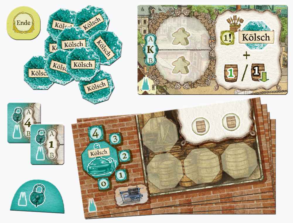 Bei der Bier Pioniere – KÖLSCH (Erweiterung) erhalten die Spielenden eine zusätzliche Mini-Brauerei samt eigenem Kessel, Fasslager und Keller. Das Modul bringt nicht nur eine neue Biersorte ins Spiel, sondern auch exklusive Aktionskarten, Kölsch-spezifische Aufträge und ein neues Aktionsplättchen „K“.