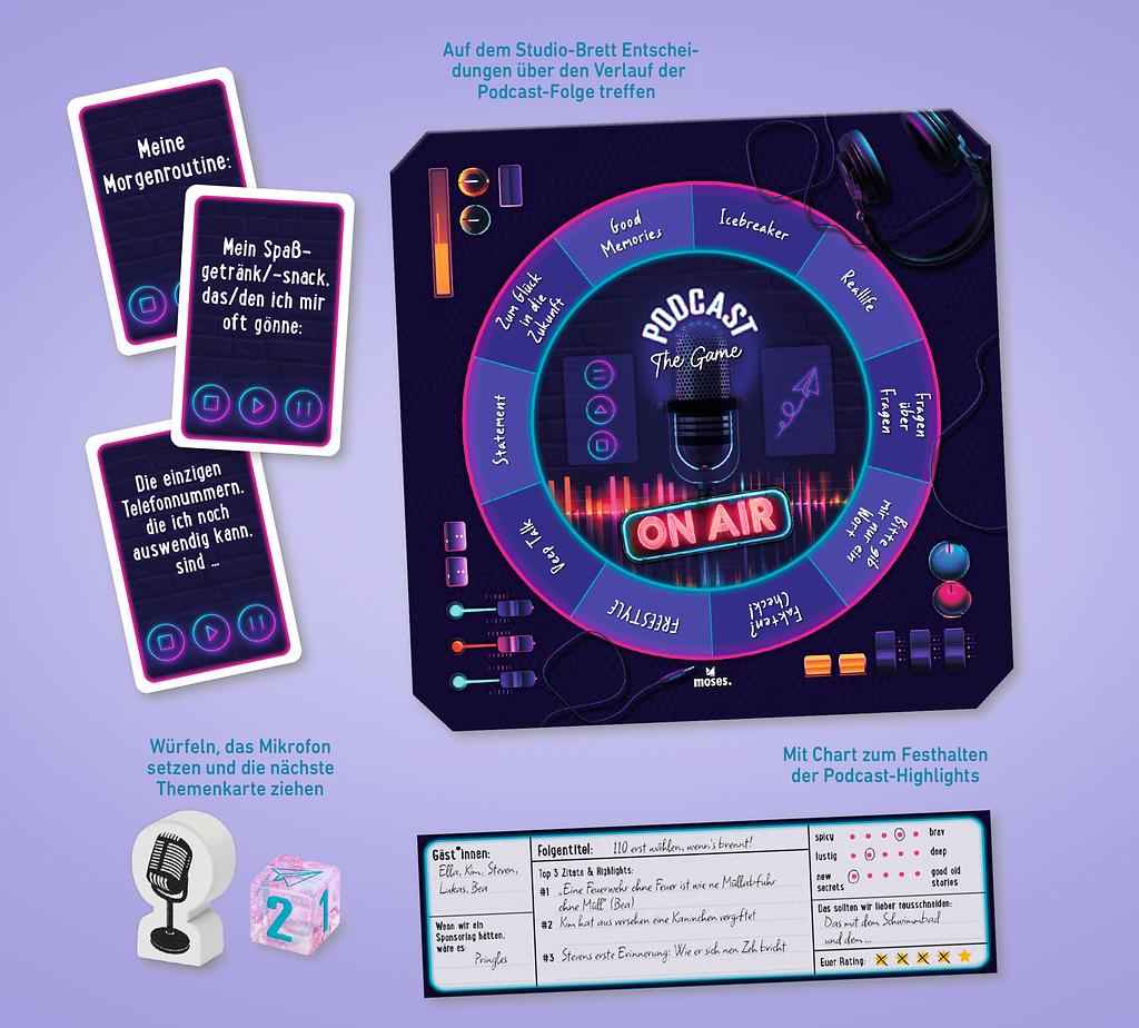 Podcast - The Game greift das Trendthema Podcast als Spiel auf, bei dem lockere, lustige oder tiefsinnige Podcast Folgen enstehen. Das Spiel enthält über 200 Themen zum Diskutieren, Lachen und Erinnerungen teilen. Dabei ist das Spielbrett das " Podcast Studio".