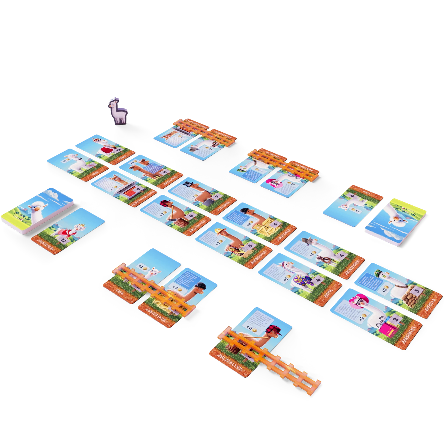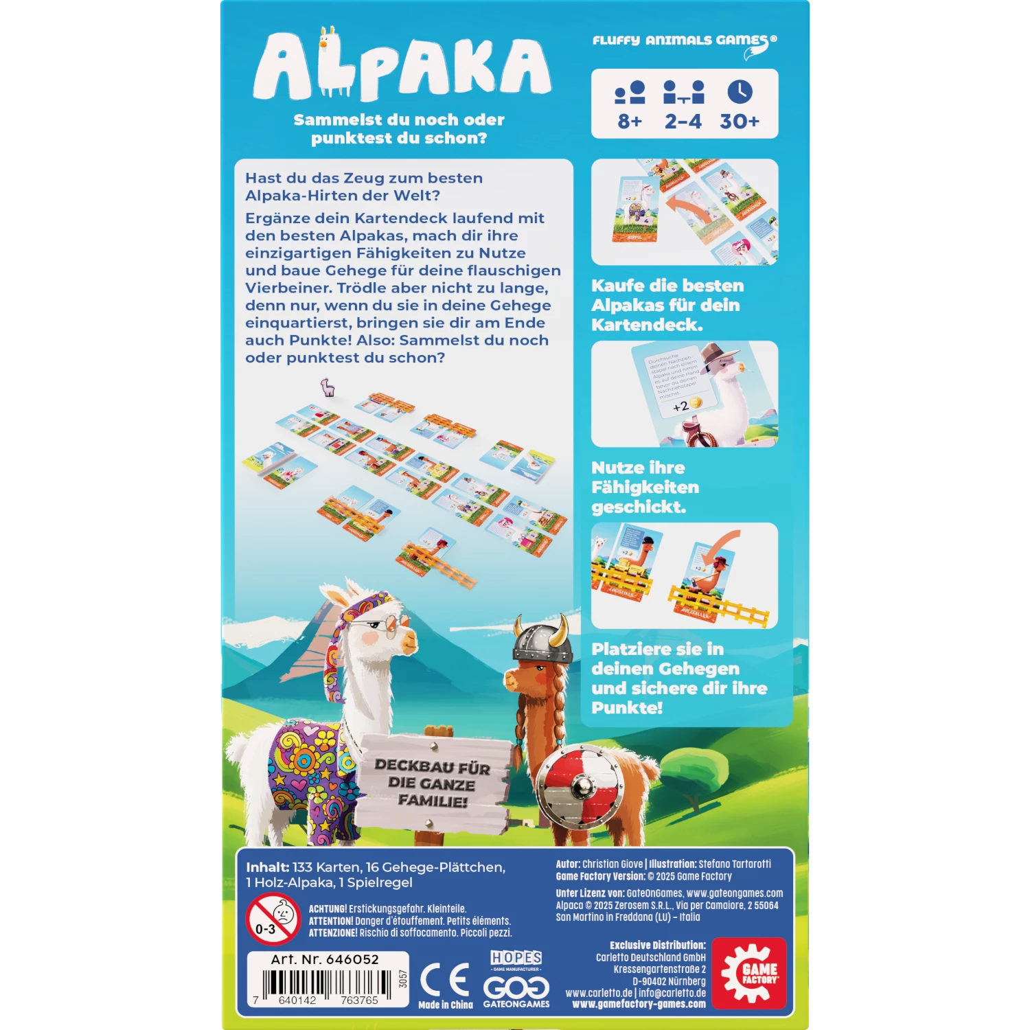 Inhalt: 32 weiße Alpakas (8 verschiedene Sets aus 4 Karten), 24 Crias (Jungtiere), 4 Übersichtskarten, 48 braune Alpakas (12 verschiedene Sets aus 4 Karten), 4 adlige Alpakas, 16 Gehege Plättchen, 4 Alpaka- Snobs, 1 Startspieler Holzfigur, 16 „Gehege im Bau“-Karte, 1 Comic-Karte (wird nicht im Spiel verwendet)