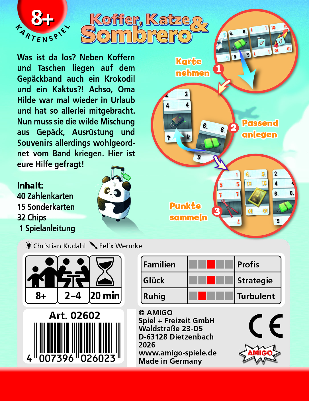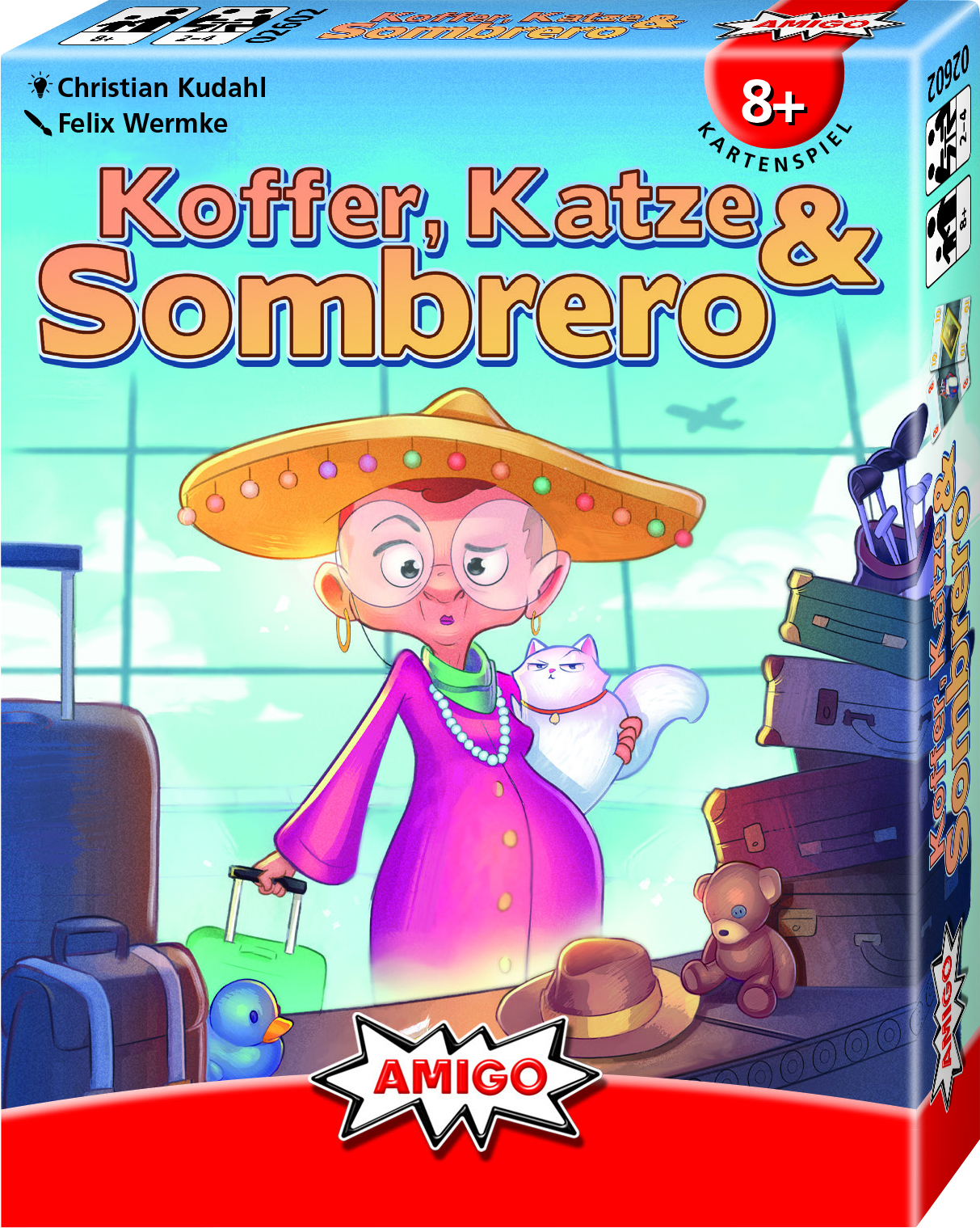 Im Kartenspiel Koffer, Katze & Sombrero gilt es, möglichst viele Gepäckstücke nach Grösse und Farbe sortiert zu sammeln, um die meisten Punkte zu machen. Wem das am besten gelingt, gewinnt nicht nur Oma Hildes Dankbarkeit, sondern auch dieses originelle Kartenspiel.