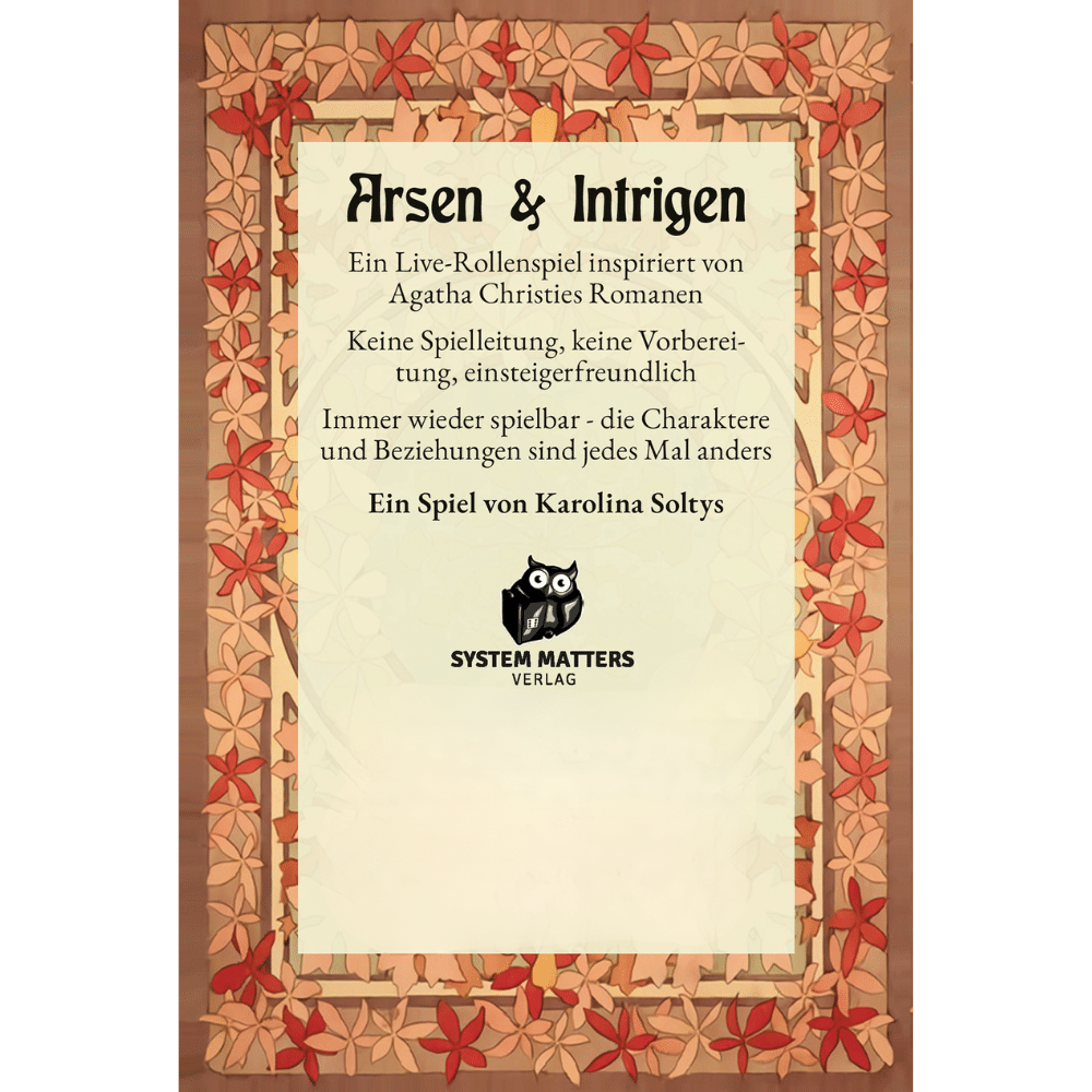 Arsen & Intrigen ist ein Live-Rollenspiel inspiriert von den Romanen von Agatha Christie. Für das Spiel wird keine Spielleitung, keine Vorbereitung benötigt und ist einsteigerfreundlich. Für eine neue Spielrunde werden die Charaktere und Beziehungen jedes Mal neu gezogen. So ist Arsen & Intriege immer wieder spielbar.