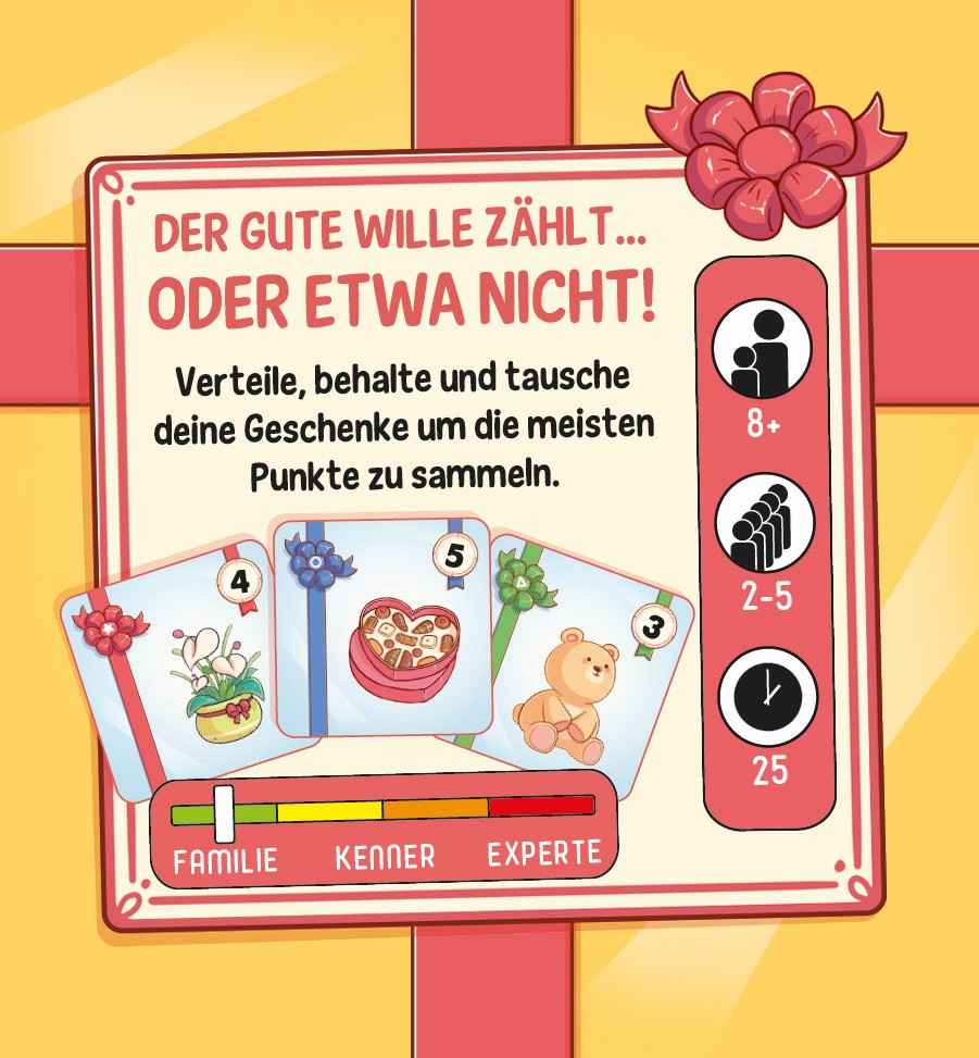 Inhalt: 65 Geschenkkarten, 4 Spielhilfen, 1 Spielregel