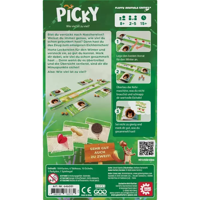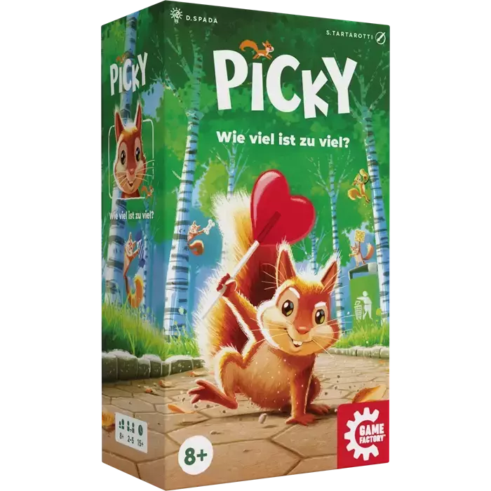 Im Spiel Picky werden die Spielenden zu Eichhörnchen, die ihren Vorrat zusammen hamstern und horten. Aber einfach nur horten und sammeln führt nicht zum Sieg. Nur wählerische Eichhörnchen mit einem guten Gedächtnis werden hier mit Erfolg belohnt. Wer nämlich zu viel oder zu wenig einer Nahrungsart sammelt, dem vermasseln die Minuspunkte schnell die Tour. Wenn man sich doch bloß noch daran erinnern könnte, wie viele Bonbons, Erdnüsse, Hundesnacks, Kekse und Lollipops man schon versteckt hat … Man darf nicht zu gierig sein und muss sich gut merken, was man gesammelt hat....