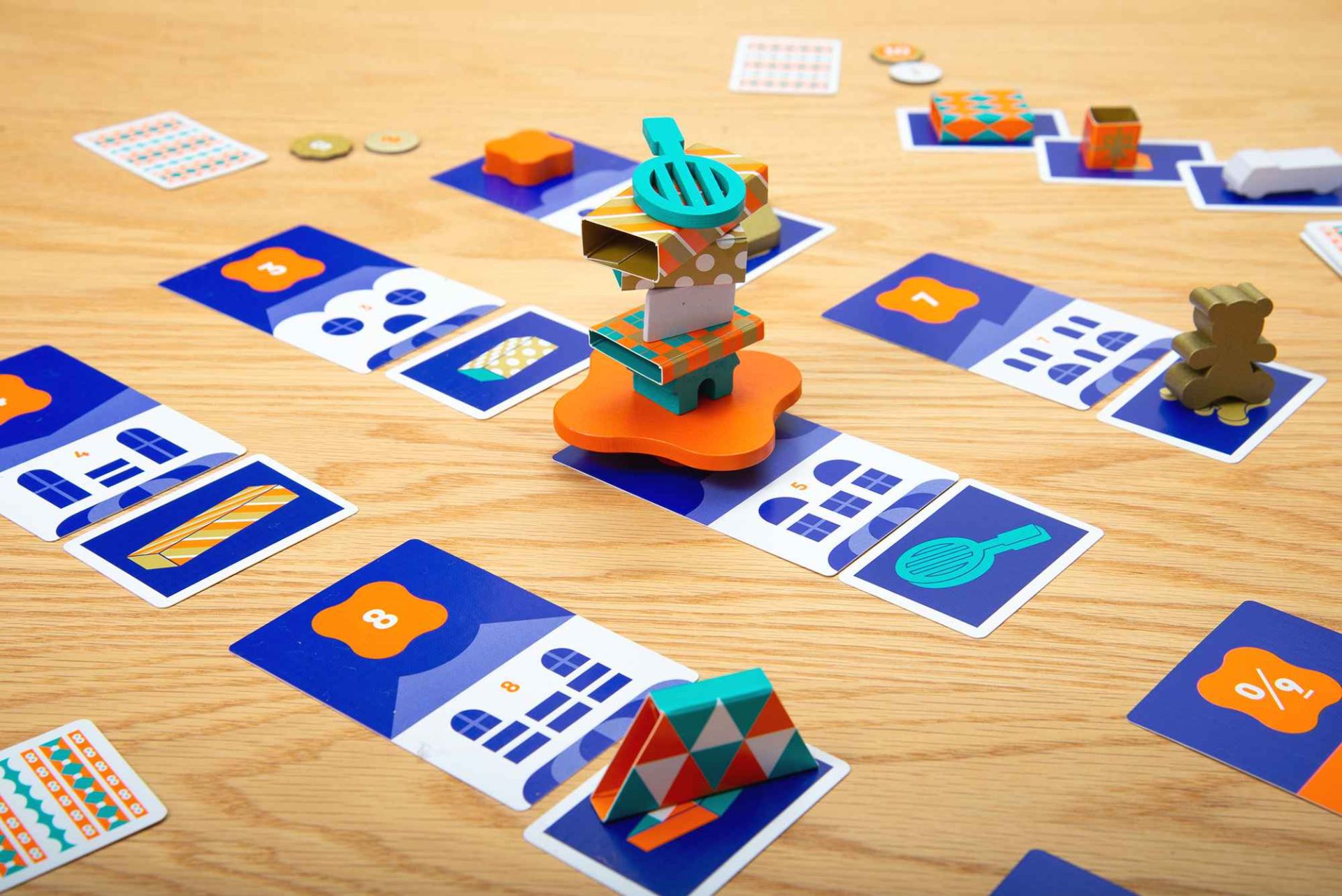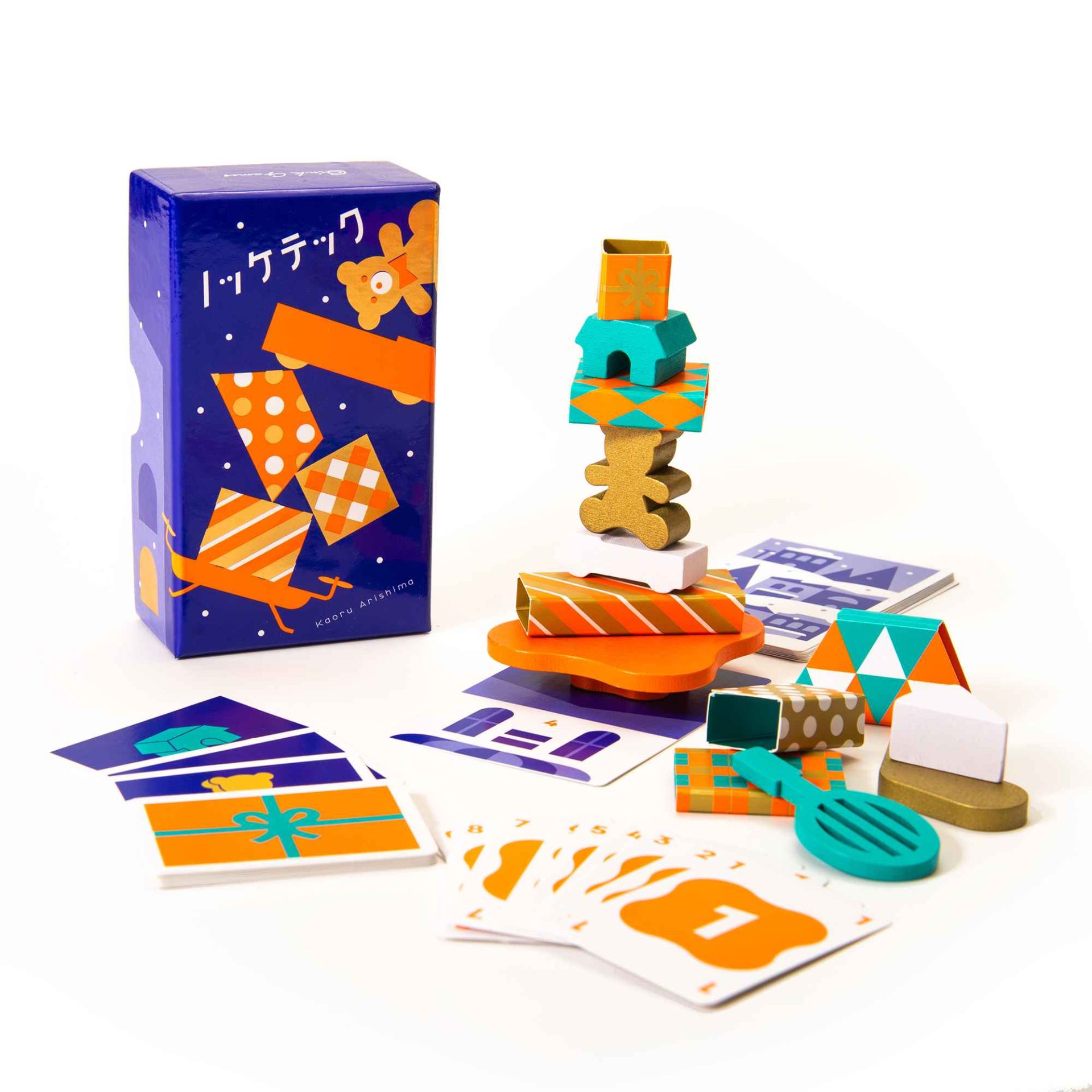 Inhalt: Holz-Drohne, 2 Landemarken, 12 Geschenke, 31 Karten, 2 Punkte-Chips, 1 Spielanleitung
