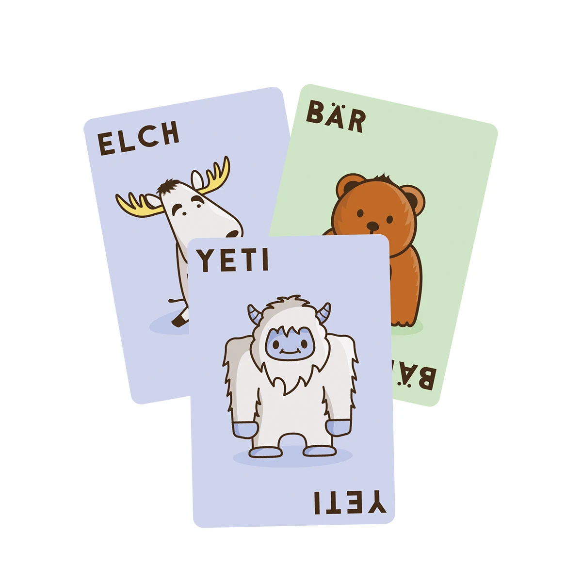 Bei Auf die Elche fertig los muss man Kartensätze von Elchen, Bären oder Eichhörnchen sammeln....aber vor Yetis und Lawinen muss man sich hüten.... denn sonst verschwinden die gesammelten Paare in der Wildnis....