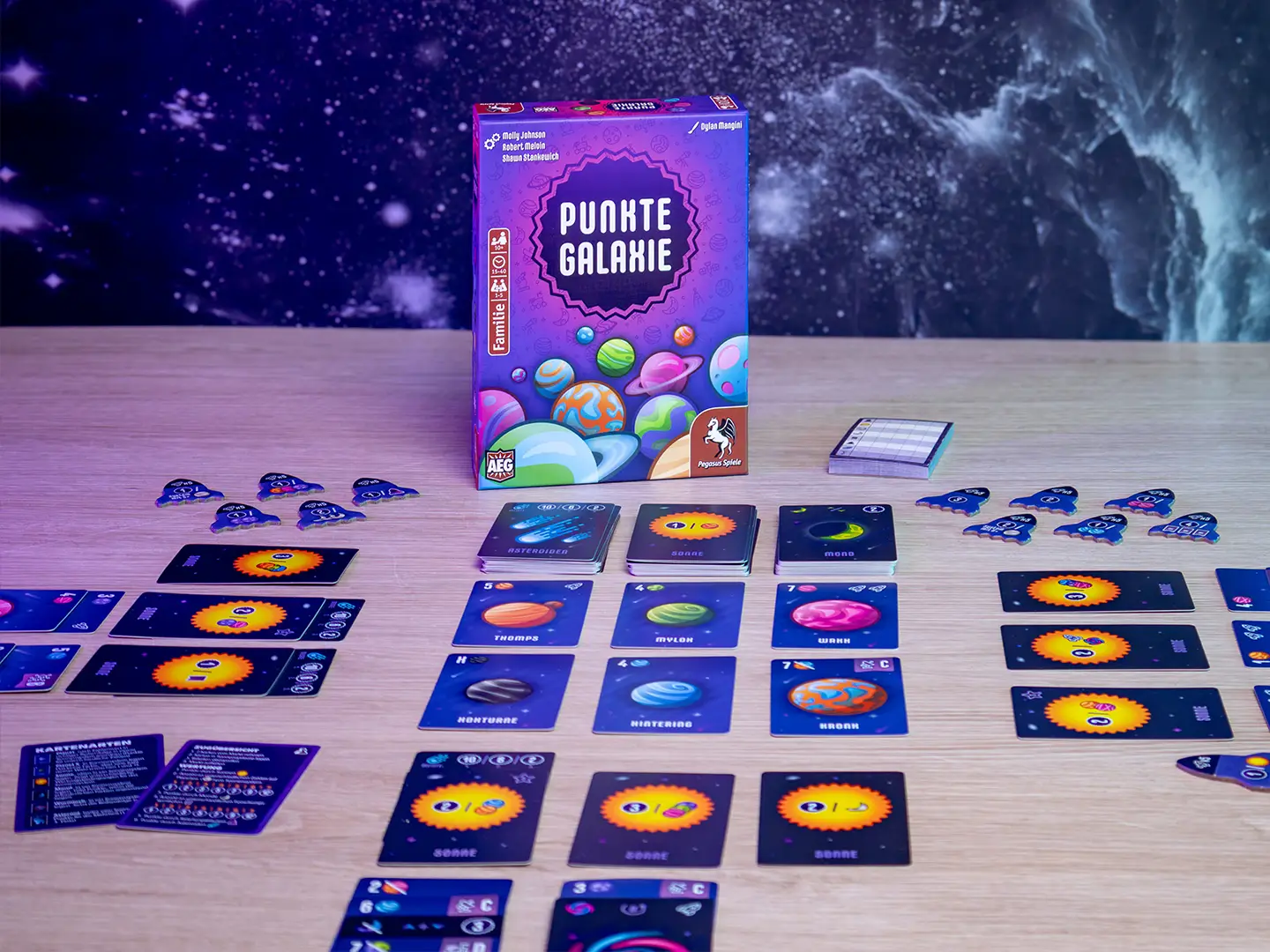 Nach dem Erfolg von Punktesalat erscheint nun Punktegalaxie. Dieses Mal bringen Sonne und Mond und mehr die Punkte. In jeder Runde wählen die Spielenden zwei Karten aus der offenen Auslage aus und legen sie in ihre Galaxie, die aus beliebig vielen Sonnensystemen bestehen darf. In jedem Sonnensystem darf jedoch nur eine Sonne und ein Asteroid liegen, aber beliebig viele Mond-, Wurmloch- und Planetenkarten. Jede Kartenart hat dabei individuelle Anlegebedingungen und bringt andere Punkte ein. Durch wechselnde Endwertungsbedingungen sowie eine Mehrheitenwertung, bleibt jede Partie spannend bis zum Schluss.