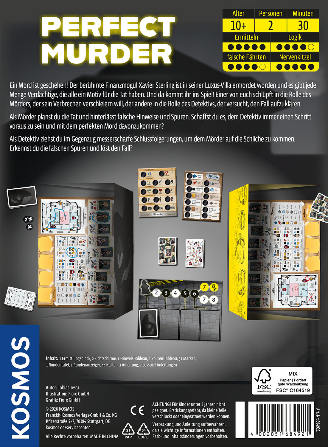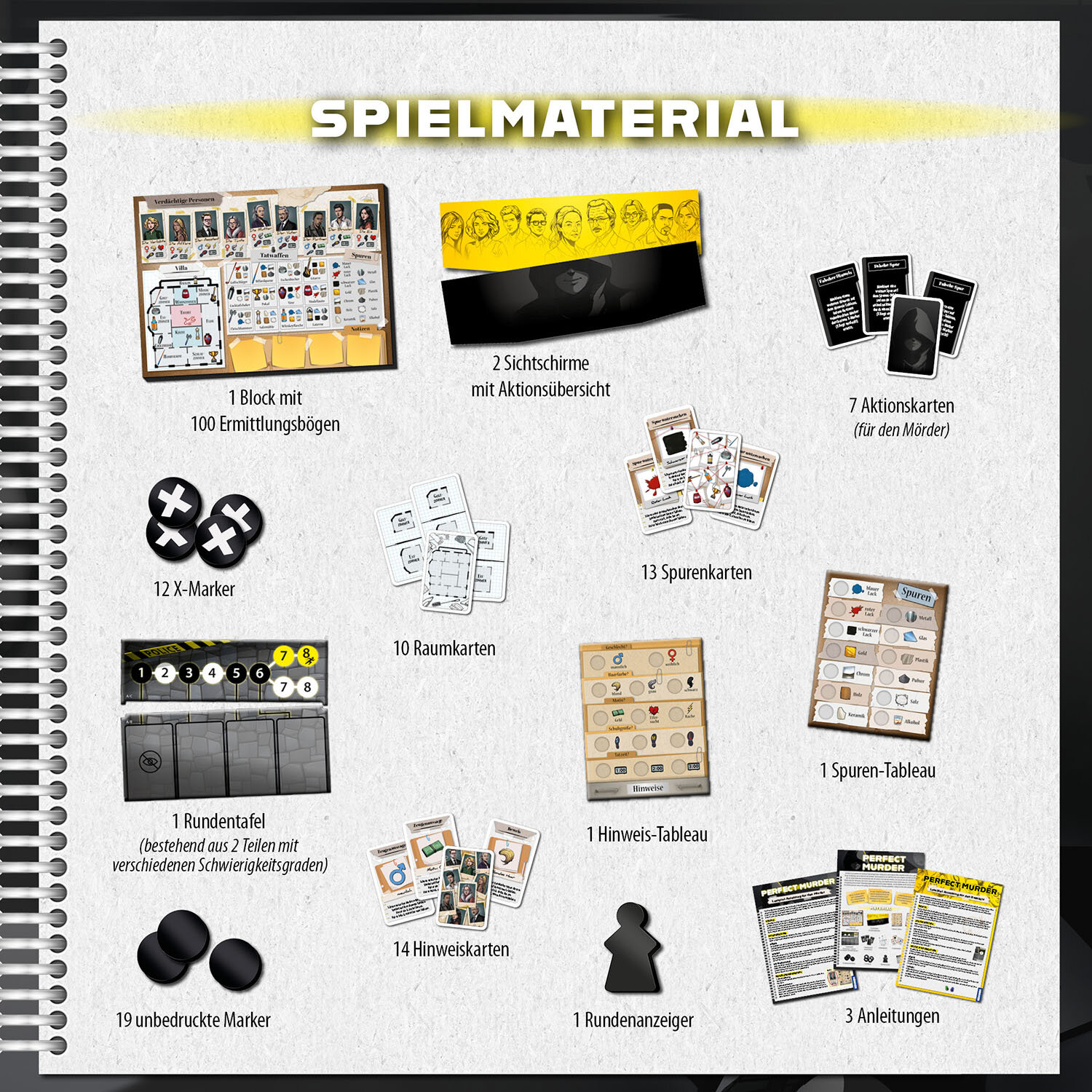 Inhalt: 1 Block mit Ermittlungsbögen, 2 Sichtschirme, 1 Hinweis-Tableau, 1 Spuren-Tableau, 31 Marker, 1 Rundentafel, 1 Rundenanzeiger, 44 Karten, 3 Anleitungen