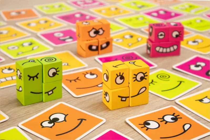 Bei Cubeez müssen die Spielenden genau hinschauen und das aktuell ausliegende Gesicht möglichst schnell mit ihren eigenen Cubeez-Würfeln nachbauen. Wer das zuerst schafft, erhält die Karte und es geht sofort mit dem nächsten Gesicht weiter...