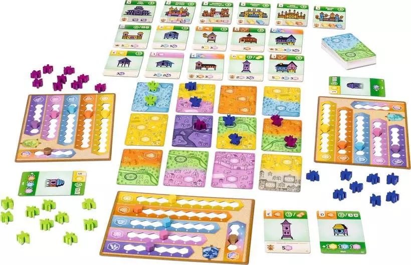 Inhalt: 60 doppelseitige Karten (Landschaften und Strukturen), 48 Holzbienen, 24 Ressourcen-Marker aus Holz, 12 doppelseitige Karten (Königinnen-Palast), 4 Spielertafeln, ein kleines Kartendeck für das Solospiel, 1 Spielanleitung