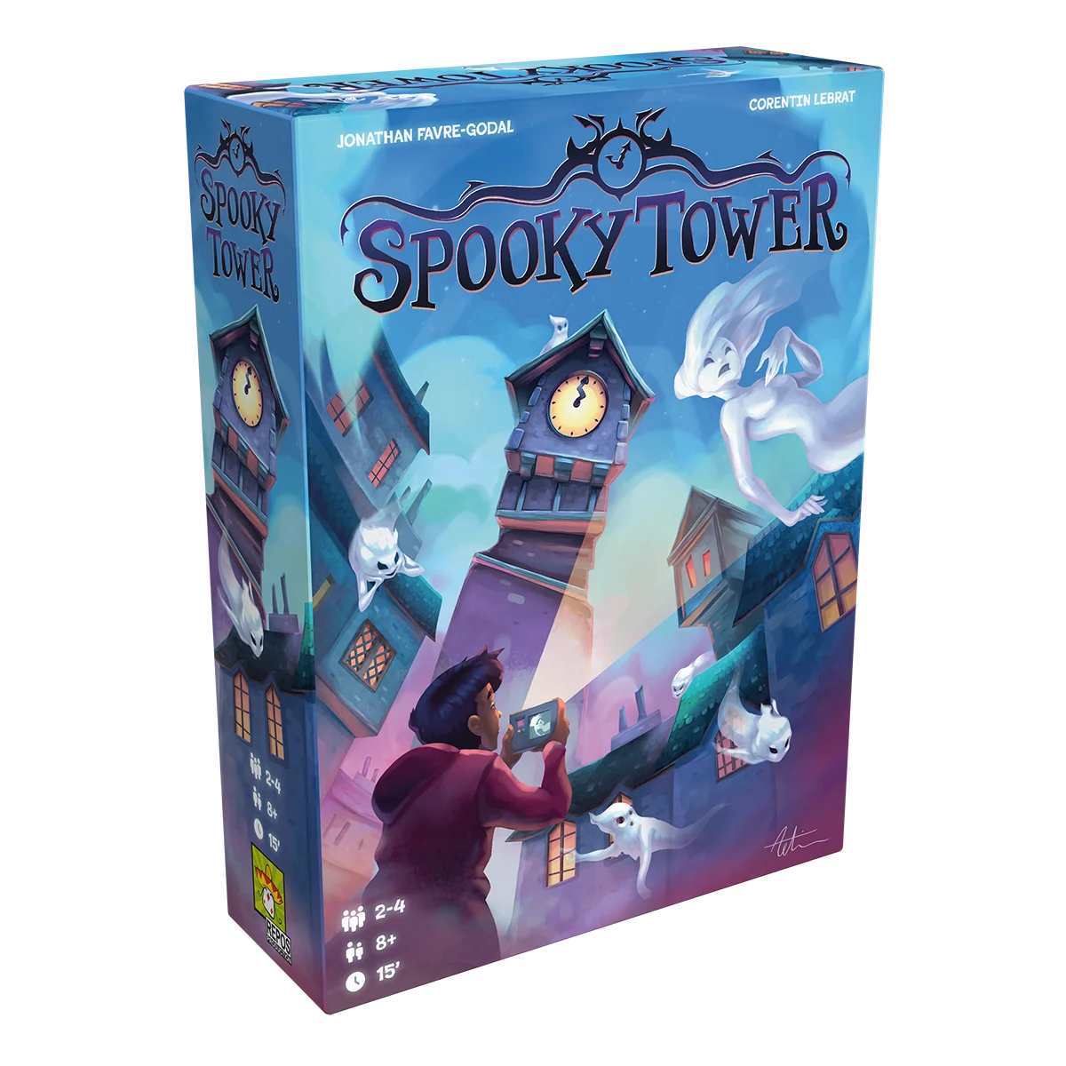 Im Spiel Spooky Tower werden die Spielenden zu Geisterjägern, die eine Stadt vor entflohenen Gespenstern retten müssen. Ziel ist es, entweder fünf Gespenster zu fangen oder drei Teile eines magischen Amuletts zu sammeln, um den Fluch zu brechen. In jedem Spielzug wird mit Hilfe des Würfelturms gewürfelt, um in den Gebäuden zu ermitteln, Gespenster zu entdecken oder besondere Bonusse und Hinweise zu sichern. Wer findet die richtige Balance zwischen ermitteln und fotografieren, um als erstes 5 Gespenster einzufangen und so das Spiel zu gewinnen?.