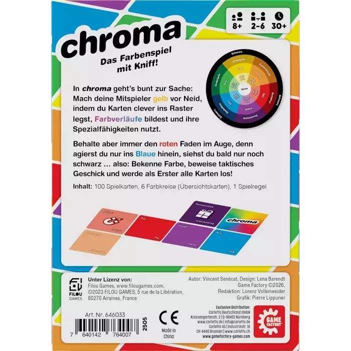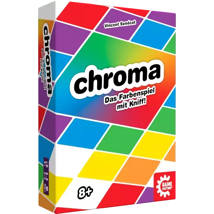 Chroma ist eine farbenfrohe Mischung aus Lege- und Ablegespiel, bei dem es gilt, als erstes alle Handkarten loszuwerden, indem man sie clever ins Farbraster auf dem Tisch legt. An je mehr Karten die abgelegte Karte dabei angrenzt, desto mehr Karten kann man auch loswerden – aber Achtung: Nur harmonische Farbverläufe sind erlaubt!