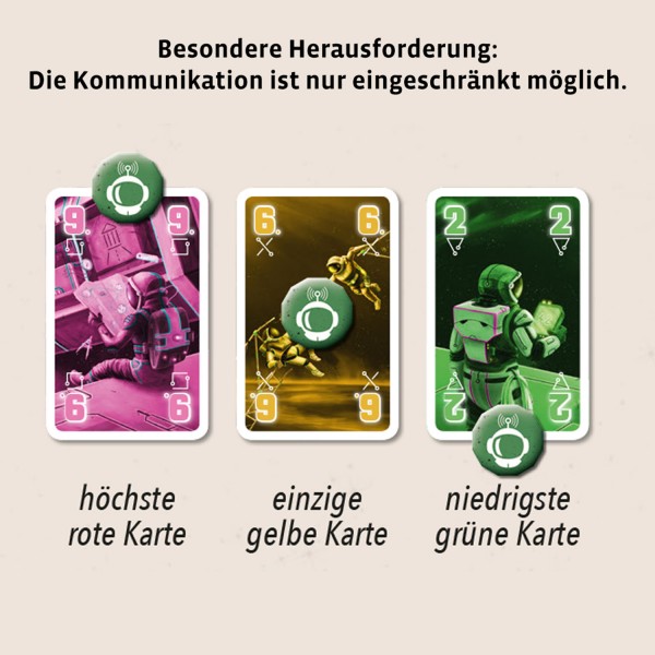 Im kooperativen Kartenspiel „Die Crew“ begeben sich die Spieler als Astronauten auf ein ungewisses Weltraum-Abenteuer. Was hat es mit den Gerüchten um den unbekannten Planeten auf sich? Ihre ereignisreiche Reise durchs All erstreckt sich über 50 spannende Missionen. Doch dieses Spiel kann nur bezwungen werden, indem gemeinsam die individuellen Aufgaben jedes Spielers erfüllt werden. Um die abwechslungsreichen Herausforderungen meistern zu können, ist Kommunikation im Team unerlässlich. Doch das ist im Weltraum schwieriger als gedacht.
